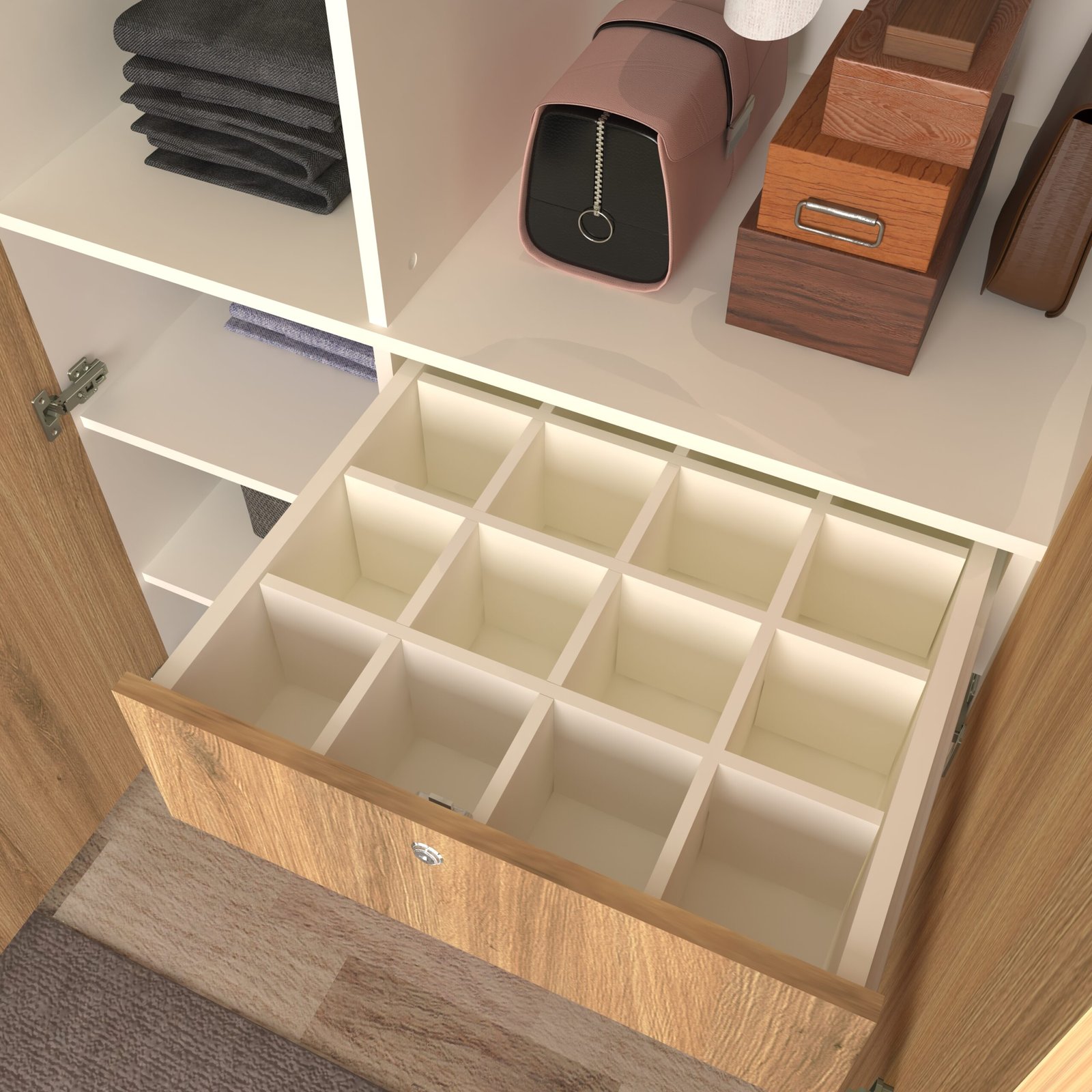 Measuring 193.8 cm (H) × 100 cm (W) × 60 cm (D), this cupboard is engineered for maximum space efficiency. It includes multiple shelves, a spacious full-length hanging section, and a customisable organiser drawer for jewellery, documents, cosmetics, and accessories.