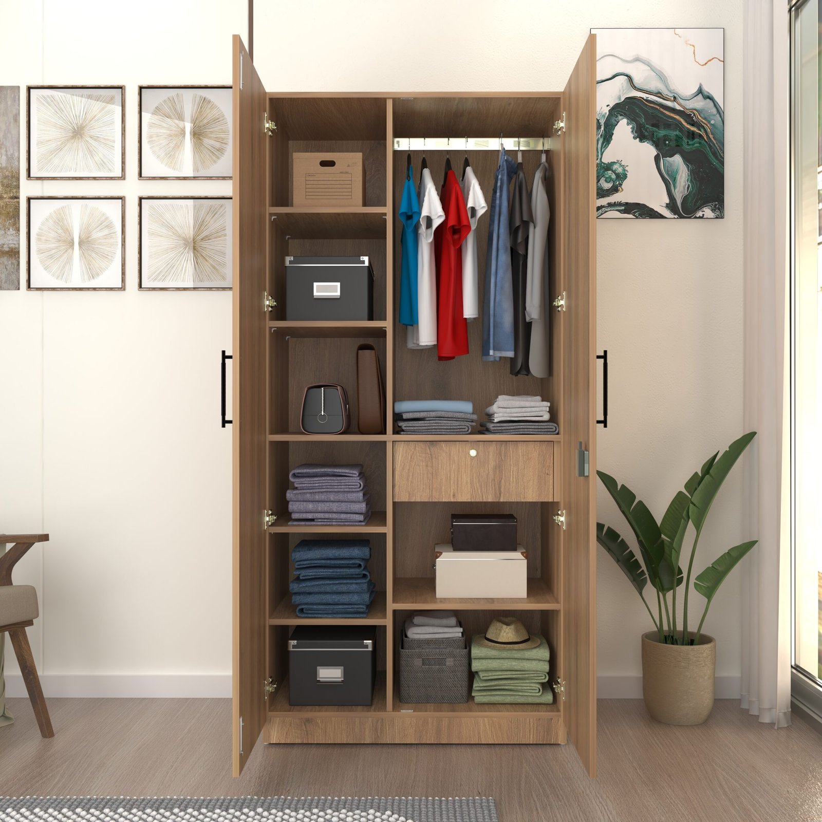 The interior layout of this cabinet is thoughtfully designed with 9 shelves and one hanging rod, offering versatile storage for folded and hanging clothes or to keep inside organisers or boxes. The cupboard has one drawer to keep clothes and accessories better organized. The 17mm thick door, side panels and shelves provide superior strength, ensuring stability and long-lasting performance. The wardrobe features soft-close hinges ensuring smooth and silent operation for an enhanced user experience, with 4 hinges per door tested to endure 50,000 cycles for long-term durability. With dual door stoppers, a 7-lever metal lock, and a lockable drawer, it offers maximum security for your essentials. The wardrobe also includes a premium designer handle, and is engineered to handle heavy loads effortlessly.