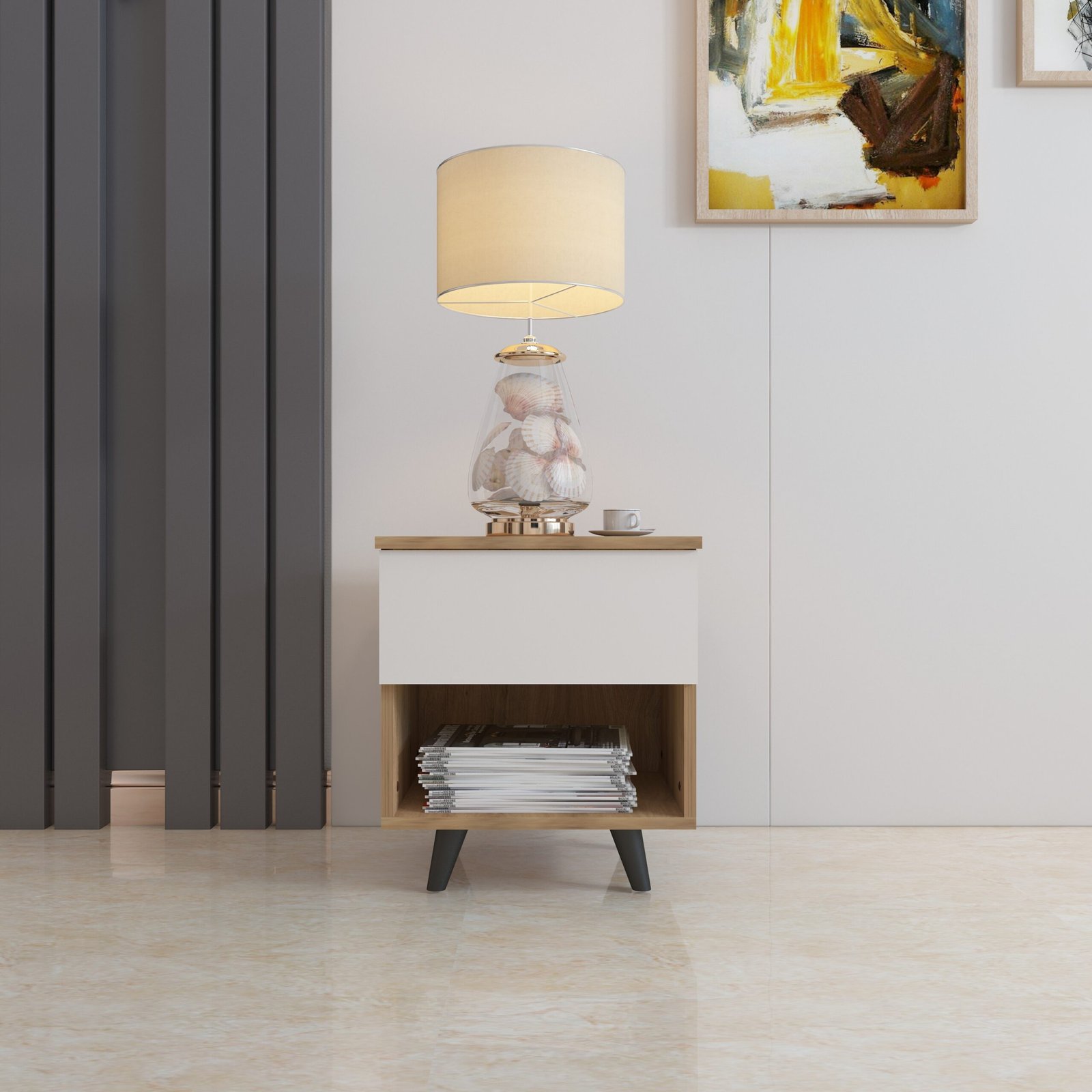 Introducing the Arvo Side Table with Legs, the perfect fusion of functionality and modern design. Crafted from premium engineered wood (high-quality particle board), it features a stunning dual-tone finish of Frosty White and Wood Oak Light, blending seamlessly into both modern and classic interiors. Measuring 45 cm (17.7 in) wide, 40 cm (15.7 in) deep, and 51 cm (20 in) high, offers ample surface and storage space. The drawer (18.5 cm / 7.2 in) provides concealed storage for essentials, while the open shelf (18.8 cm / 7.4 in) keeps books or décor easily accessible. Supported by 10 cm (3.9 in) high black metal legs, it ensures stability, durability, and a touch of industrial charm. Ideal as a bedside table or a nightstand, Arvo side table with Legs elevates any room with its clean design and functional elegance.