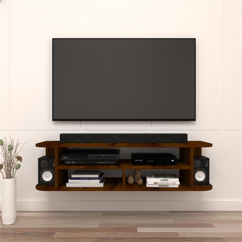With dimensions of 120 cm (Width) x 14.87 cm (Depth) x 30 cm (Height), this minimalist TV cabinet is intelligently structured with 6 open shelves, providing ample storage for your home entertainment setup. Easily organize your TV box, gaming consoles, soundbars, routers, remotes, and other accessories. It also functions as a TV display cabinet and a floating wall shelf, offering extra space to showcase decorative items, books, or indoor plants.