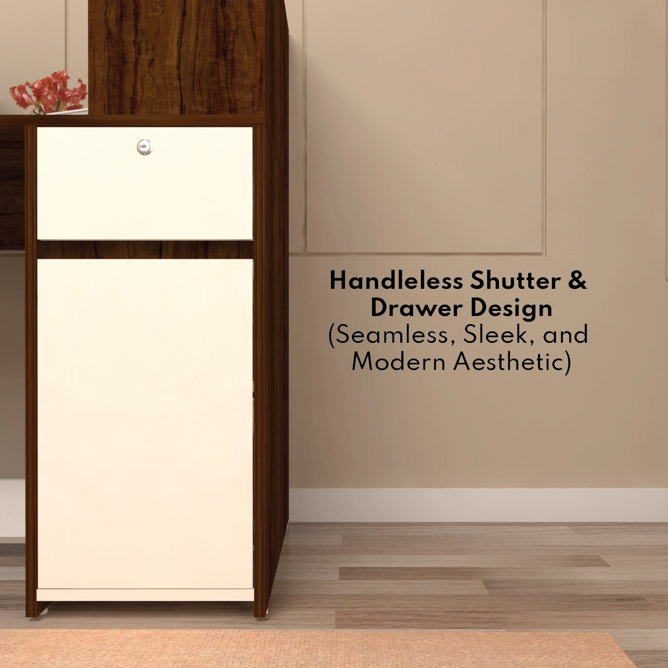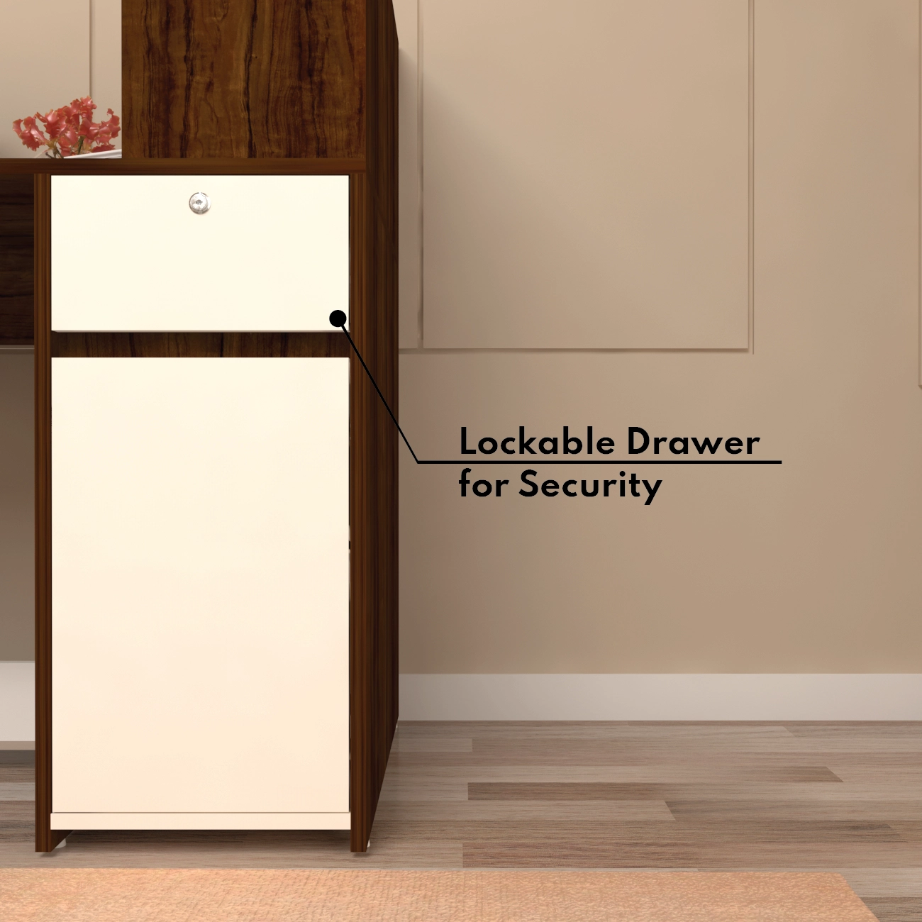A lockable drawer provides secure storage for personal items or documents, ensuring privacy and organization. The study table has a handleless shutter design. The drawer can also be opened using the same handless feature. The desk also features a cable organizer to keep cords tidy and a footrest for added ergonomic comfort. The Berio Study Table combines functionality, style, and durability, making it an excellent choice for any workspace, whether at home or in the office.