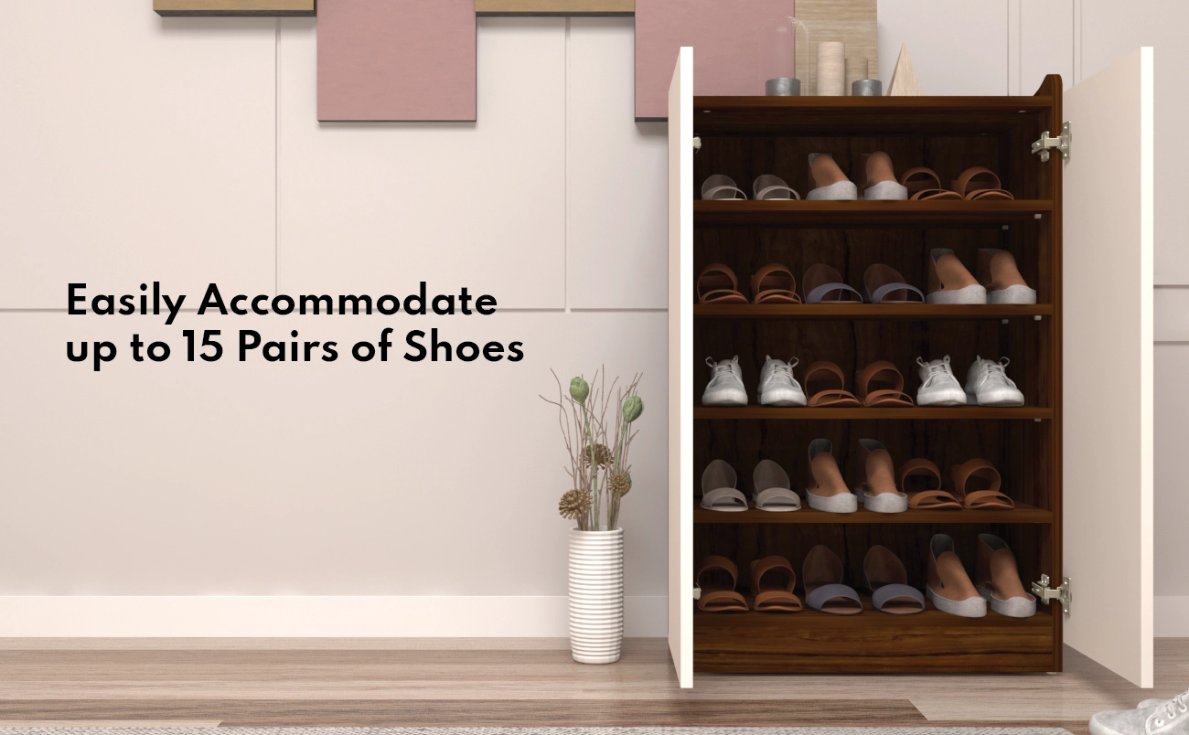 Cabrolo Shoe Rack is a stylish storage solution designed for modern spaces. Crafted from premium engineered wood (particle board), it features an elegant dual-tone finish of Brazilian Walnut and Frosty White that blends effortlessly with contemporary interiors. With a width of 63.4 cm and a height of 100.3 cm, this shoe cabinet is ideal for entryways, bedrooms, or living spaces. It offers storage for up to 15 pairs of shoes with height-adjustable closed shelves to accommodate different footwear sizes. The top surface can be used for displaying décor items or storing daily essentials. Curved side panels add a unique visual flair, enhancing both the functionality and aesthetics of the design.