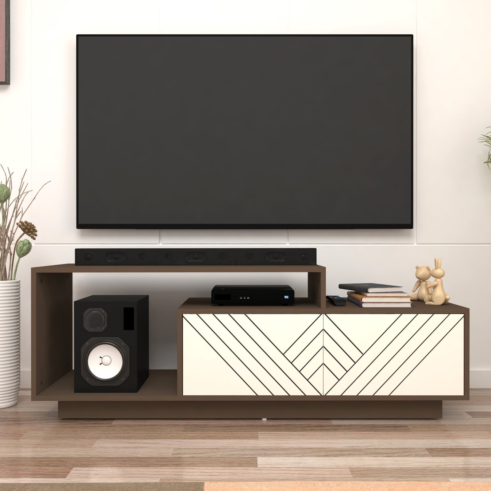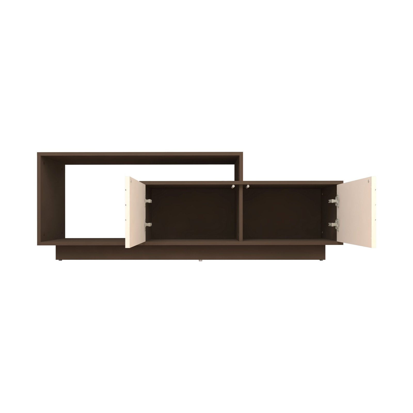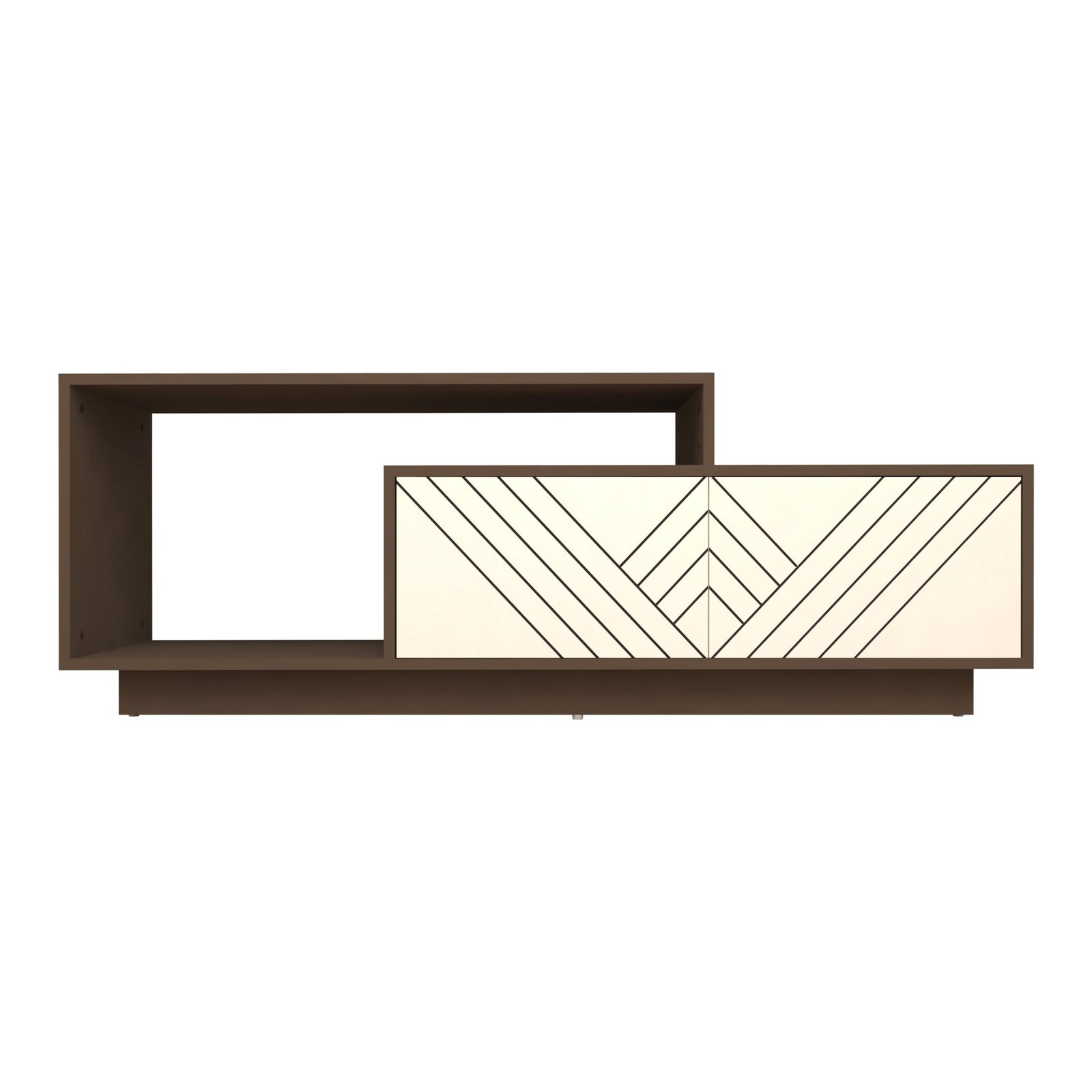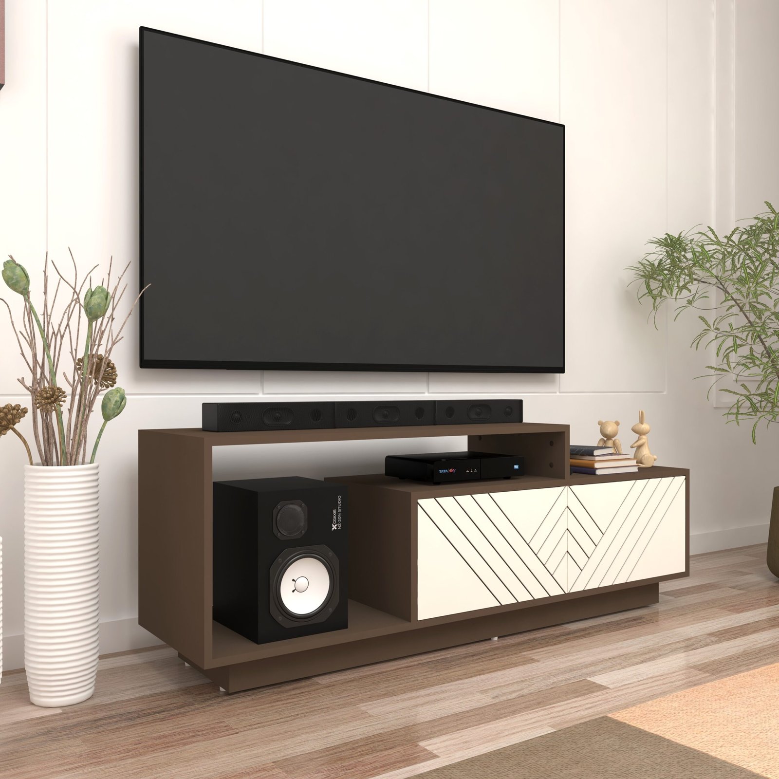 Enhance your living space with the Caspo TV Unit, a modern entertainment unit crafted from premium engineering wood and finished with a designer MDF shutter featuring precision-machined groove detailing. The elegant Mocha Brown & Frosty White colour combination creates a warm yet contemporary aesthetic, making it a perfect addition to modern living rooms.