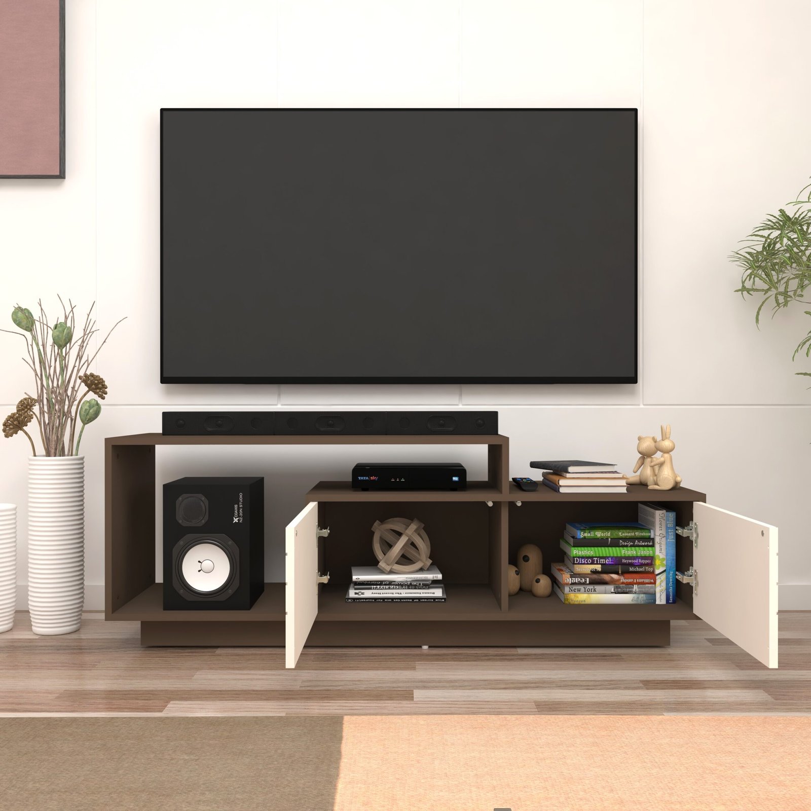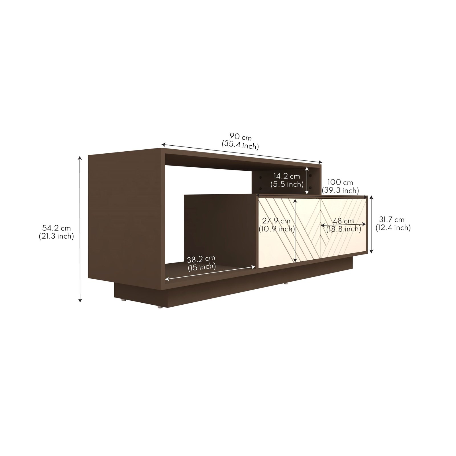 Designed for both style and functionality, this TV unit offers a smart mix of open shelves and closed storage, ideal for organizing media devices, décor pieces, books, and accessories. With a thoughtfully balanced structure measuring 100 cm (39.3 in) in width, 54.2 cm (21.3 in) in height, and 38.2 cm (15 in) in depth, it delivers ample storage while maintaining a compact, space-efficient footprint suitable for apartments and modern homes.