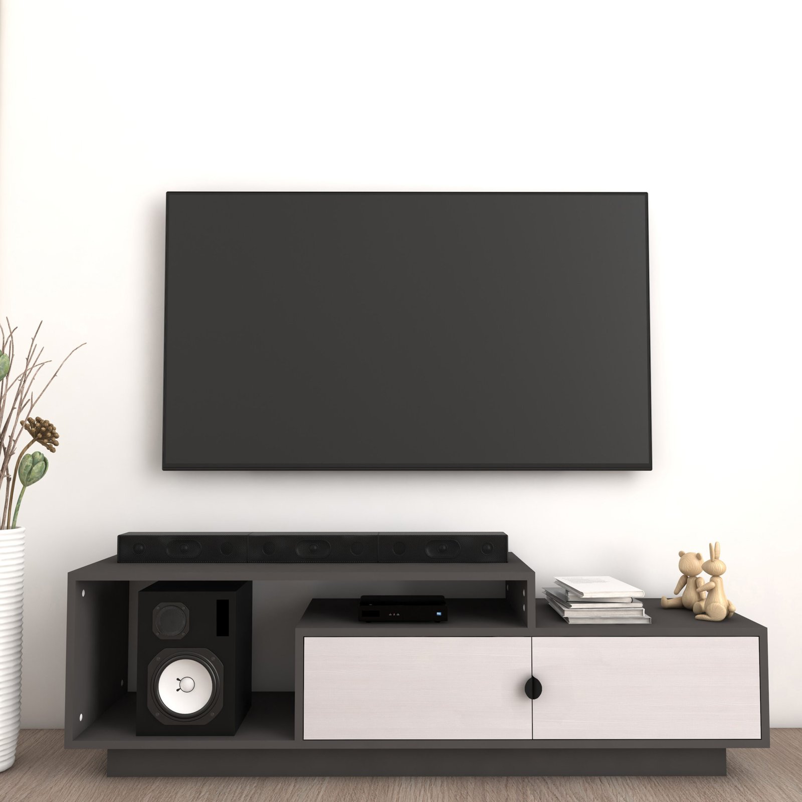 The Caspo TV Unit brings style and functionality together with its striking dual-tone design in contrasting light and dark grey hues. Made from premium engineered wood, this modern TV unit is designed to accommodate TVs up to 55 inches, providing a practical and stylish solution for your entertainment needs. Measuring 140 cm in length, 40 cm in depth, and 54 cm in height, the unit features four open shelves, perfect for placing a soundbar, electronic devices, decor, and more. It also includes two shutter doors with elegant black handles, offering closed storage space to keep books, person items, and other essentials neatly organized and out of sight.