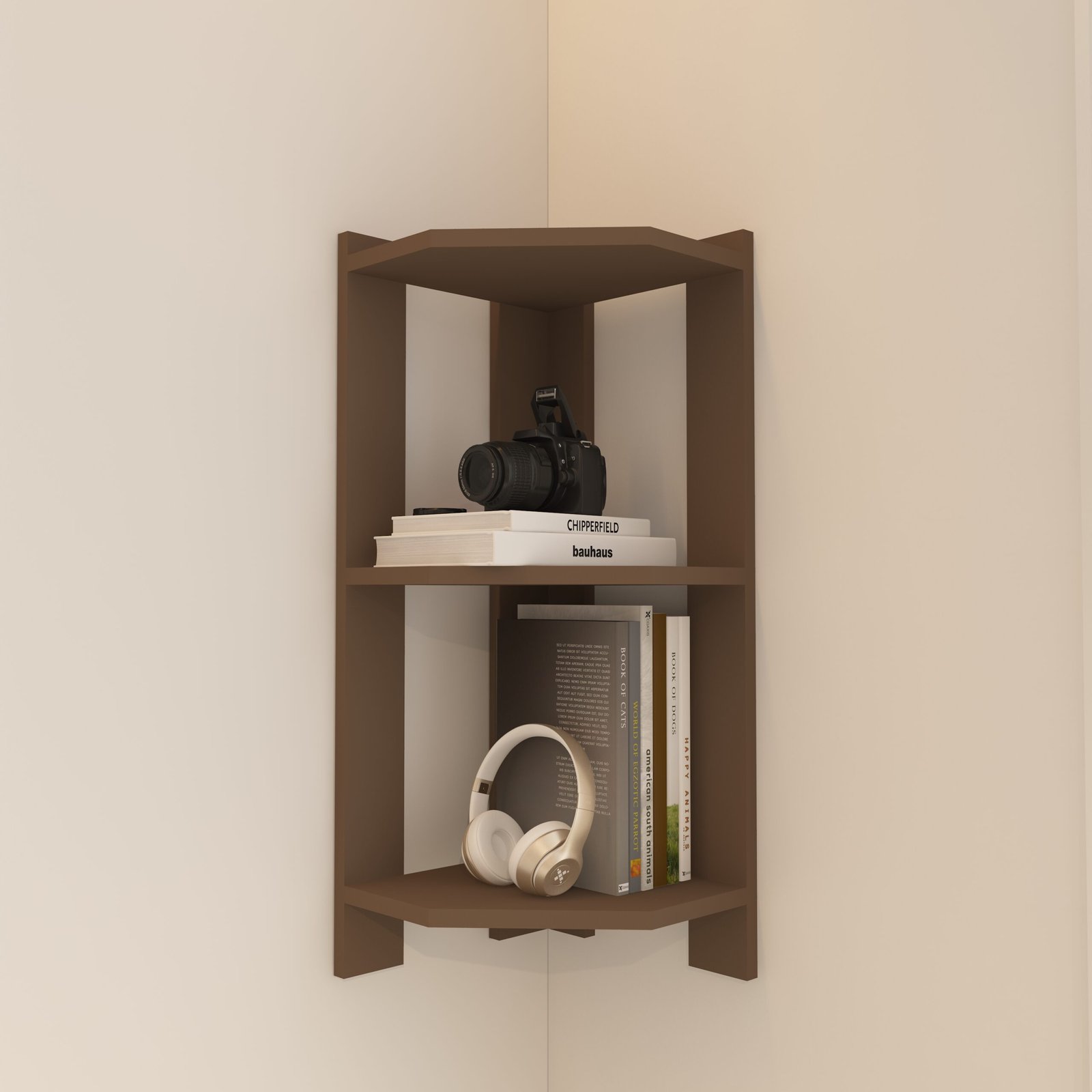 Upgrade unused corners into stylish storage with the modern Corves Corner Wall Shelf in a rich mocha brown finish. Designed to maximize vertical corner space, this wall mounted wall storage adds warmth, elegance, and functionality to your living room, bedroom, office, or study area.