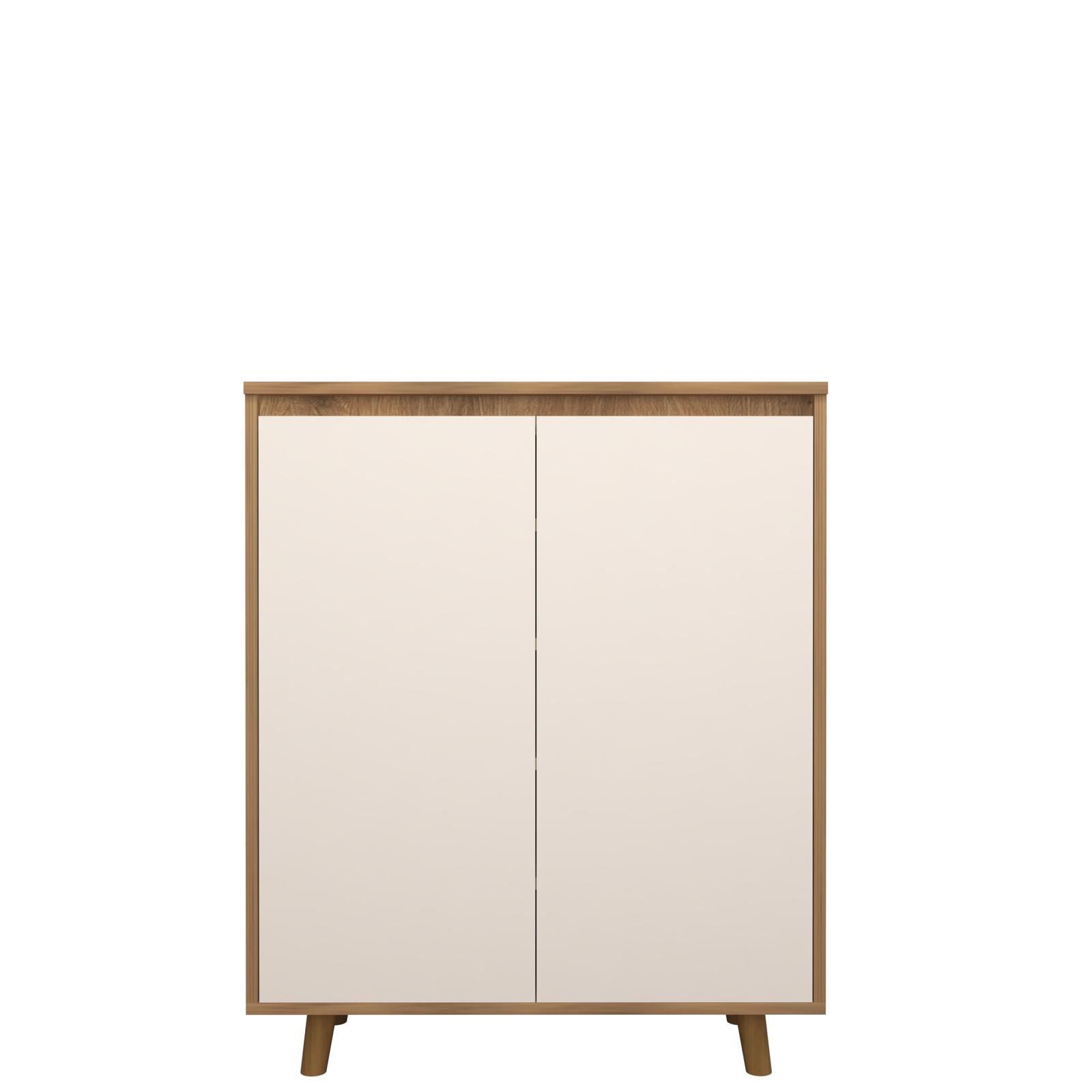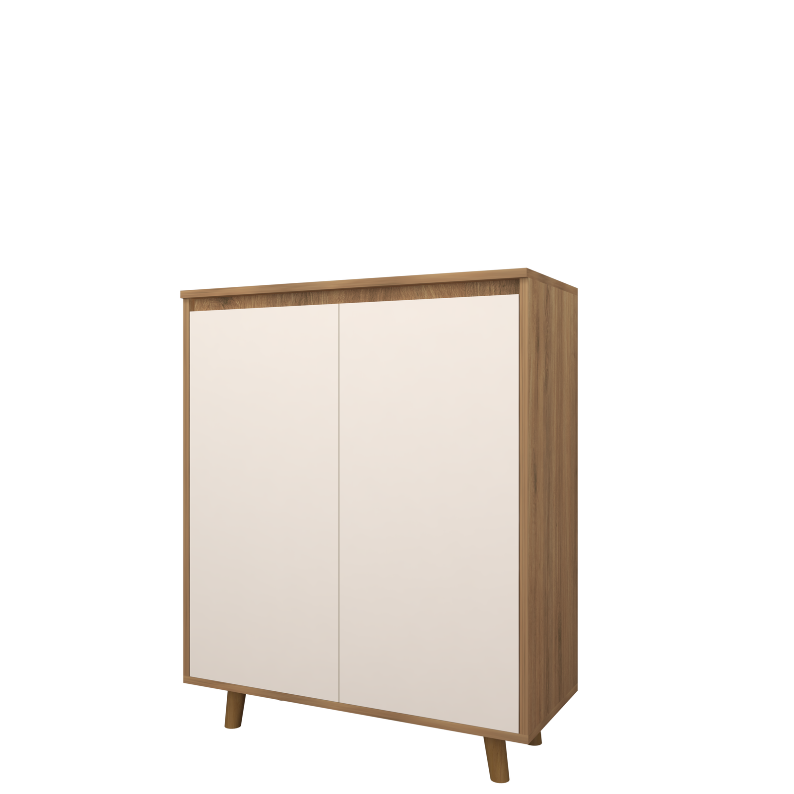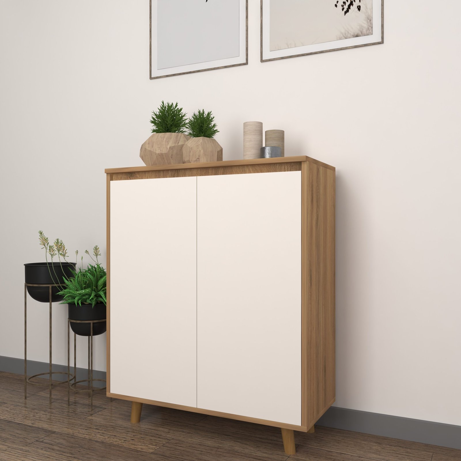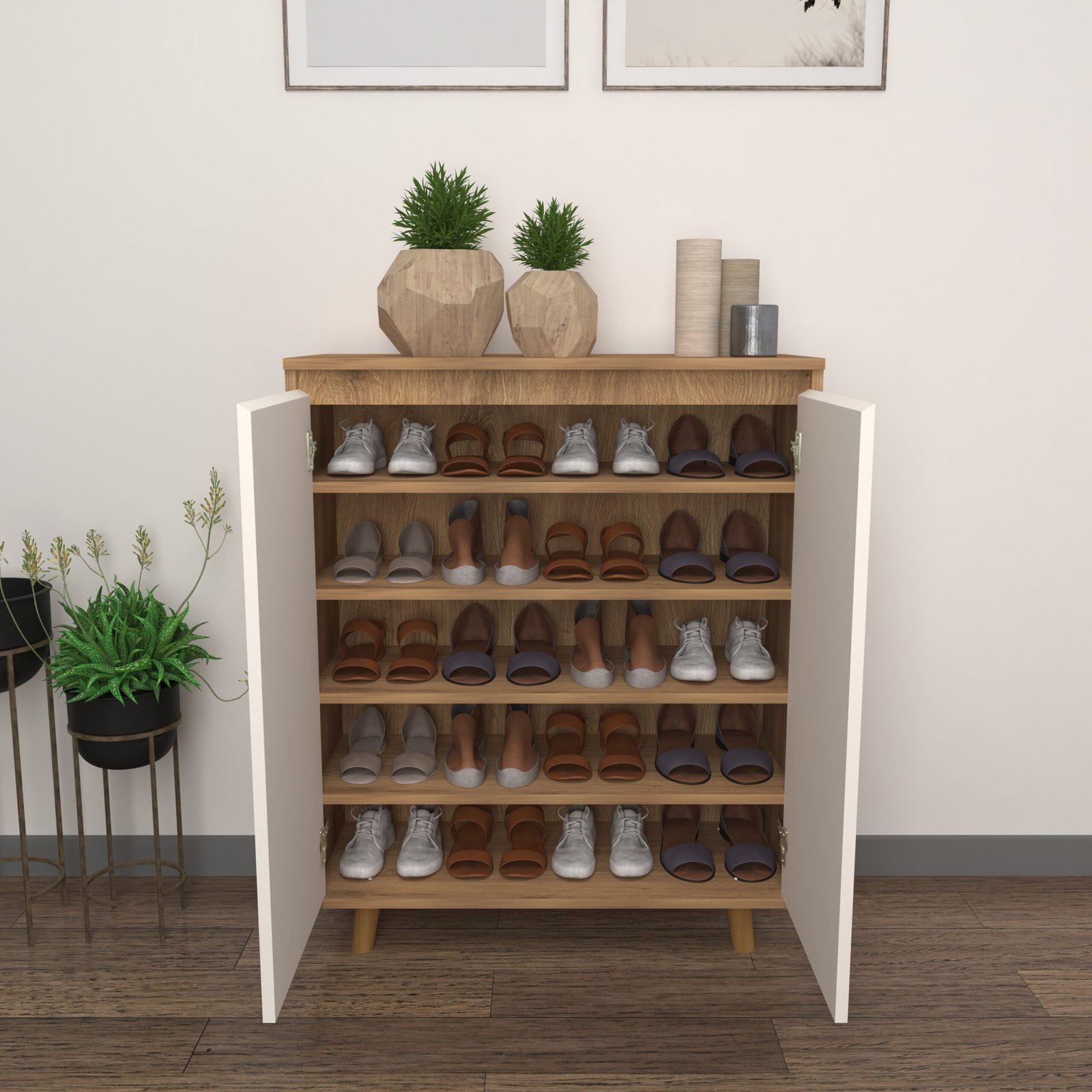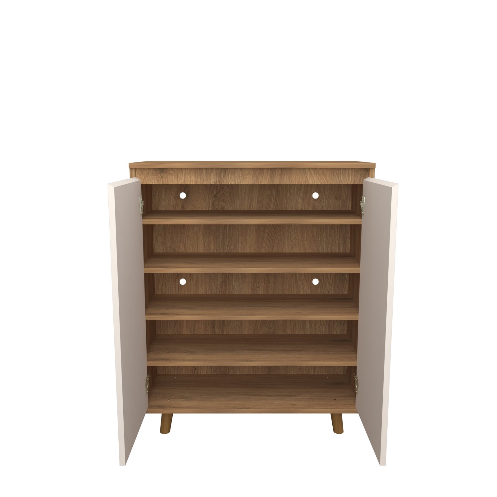 The handle-less design enhances its premium and minimalistic appeal, making it a stylish addition to any room. The top surface provides extra utility, ideal for placing decor pieces, key holders, or daily essentials. Crafted from premium engineered wood in a dual-tone oak light and frosty white finish, the Droove Shoe Rack complements contemporary interiors effortlessly. Elevated by solid teak wood legs, this shoe cabinet not only offers a refined look but also ensures stability and durability for long-lasting use.