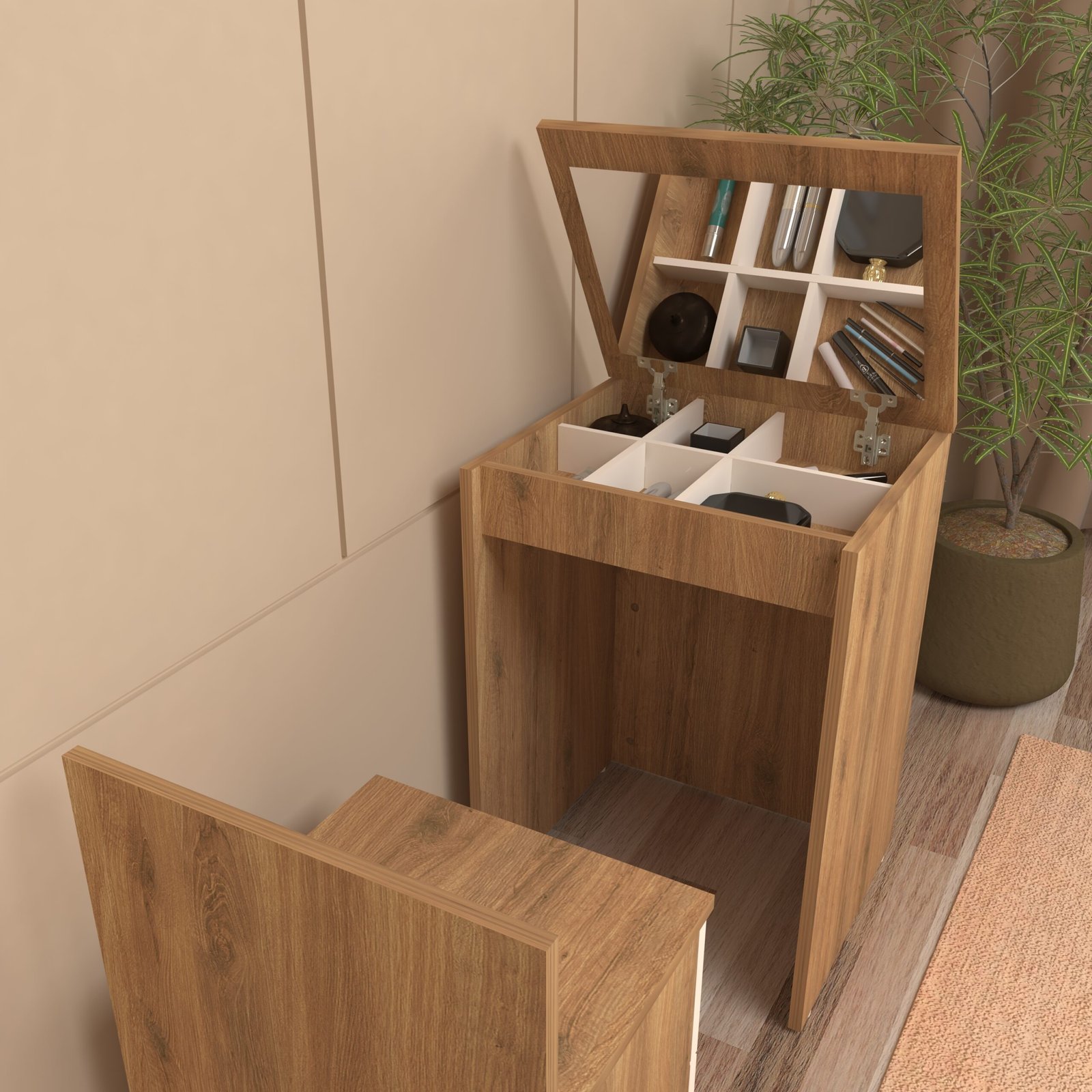 Upgrade your bedroom or dressing space with this Compact Wooden Dressing Table Set, designed for modern homes that value both style and functionality. Crafted from high-quality engineered wood, this minimalistic vanity table features a natural oak-finish tone that blends seamlessly with any interior décor. Its smart space-saving structure makes it perfect for small rooms, apartments, and studio layouts. The set includes a matching compact stool includes 2 spacious drawers for storage that fits neatly under the table when not in use, helping you maintain a clean and clutter-free look. The stool also provides a stable and comfortable seating experience, making daily grooming effortless and enjoyable.