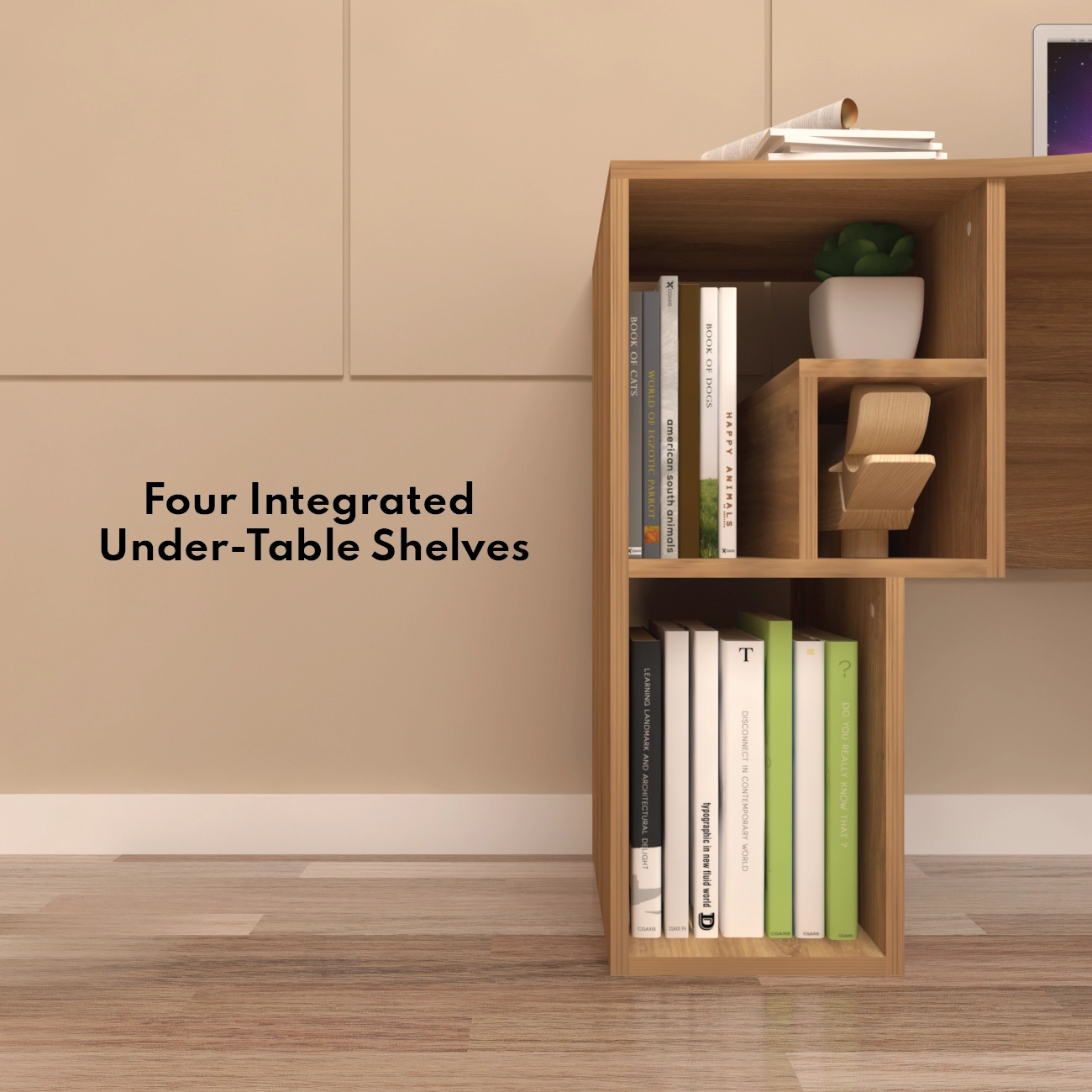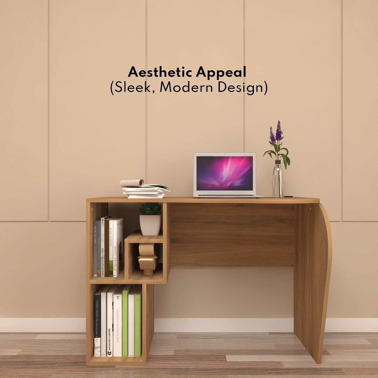 Ergonomic Design: Petal-inspired curved surface increases usability, offering a depth of 45 cm to 59 cm., Dimensions: Length of 107.5 cm (42.3 inch), providing a spacious workspace., Material: Constructed from high-quality engineered wood for durability and stability., Cable Management: Built-in cable organizer ensures a clutter-free workspace., Storage: Includes four integrated shelves for convenient storage of books, supplies, and more., Aesthetic Appeal: Sleek, modern design fits well with both contemporary and traditional decor.