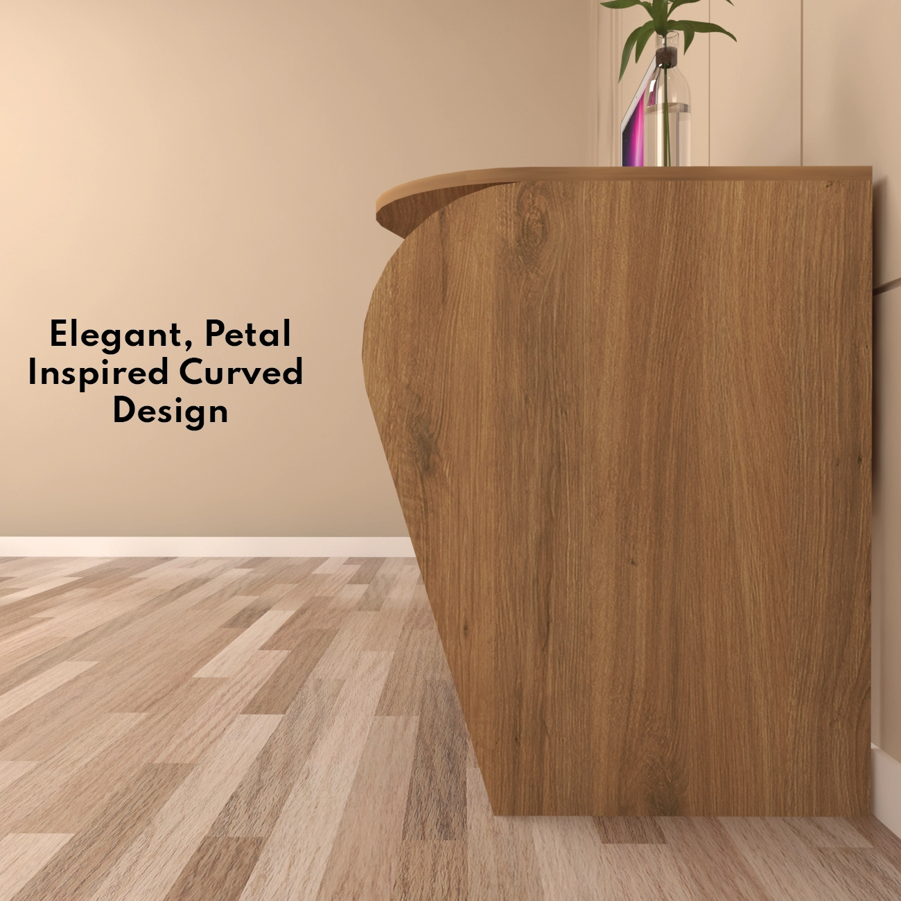 Floro study table stands out with its unique, petal-inspired curved design that not only adds a touch of elegance but also enhances functionality. It features a dynamic depth that starts at 45 cm and extends to 59.5 cm, accommodating various work or study related activities. The table spans 107.5 cm in length and stands at a height of 77 cm, providing a spacious work surface suitable for multitasking in any office or study area. Crafted from premium engineered wood, this table ensures durability and stability while maintaining a sleek, modern aesthetic. It includes four integrated shelves beneath the work surface, offering ample storage for books, office supplies, and decorative items, keeping essentials organized and within easy reach. Additionally, a built-in cable organizer helps maintain a neat and clutter-free workspace by managing all wires and cables effectively.