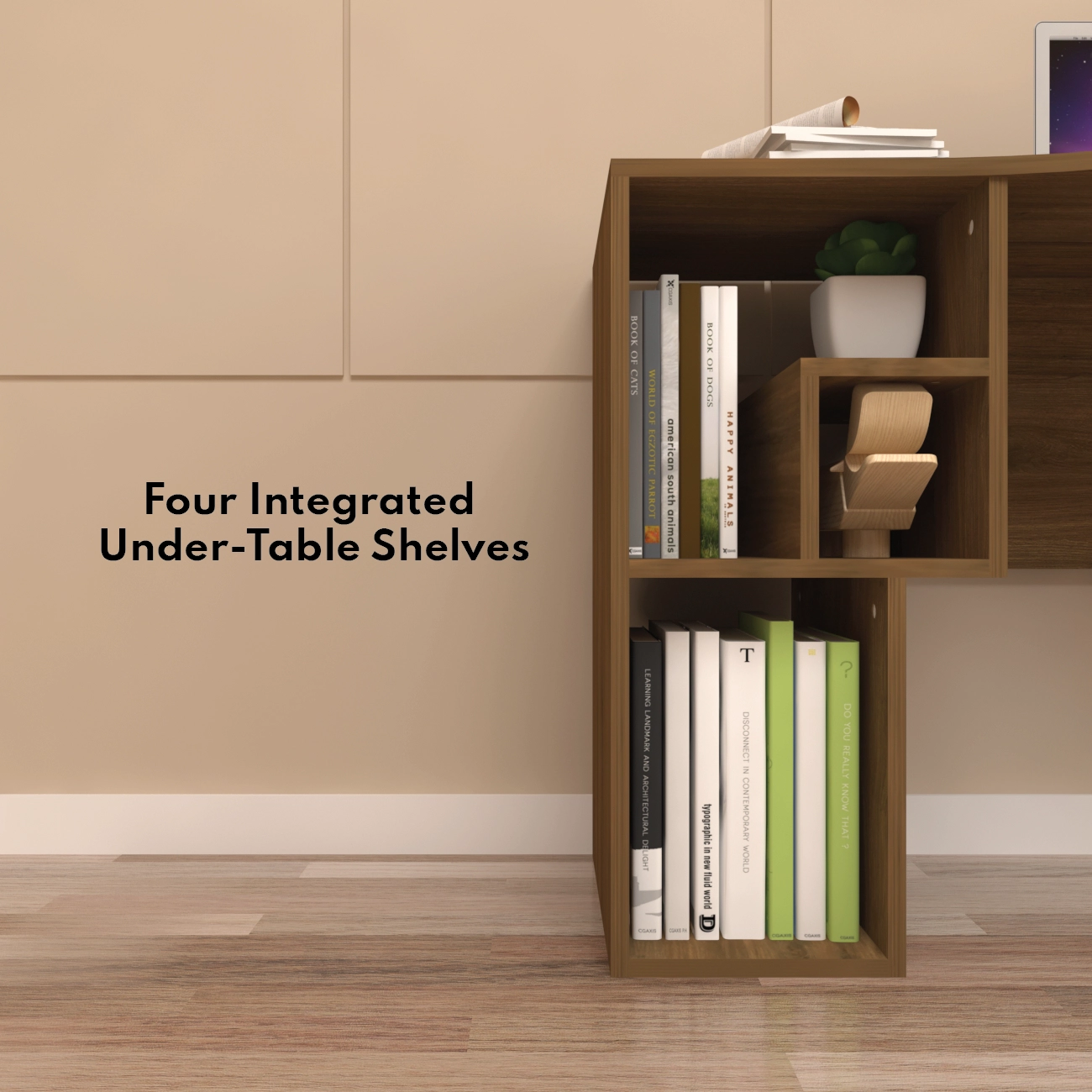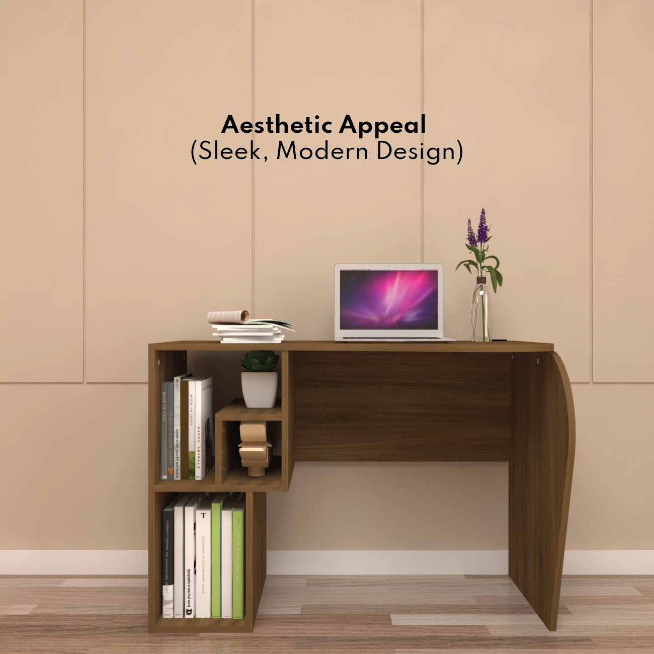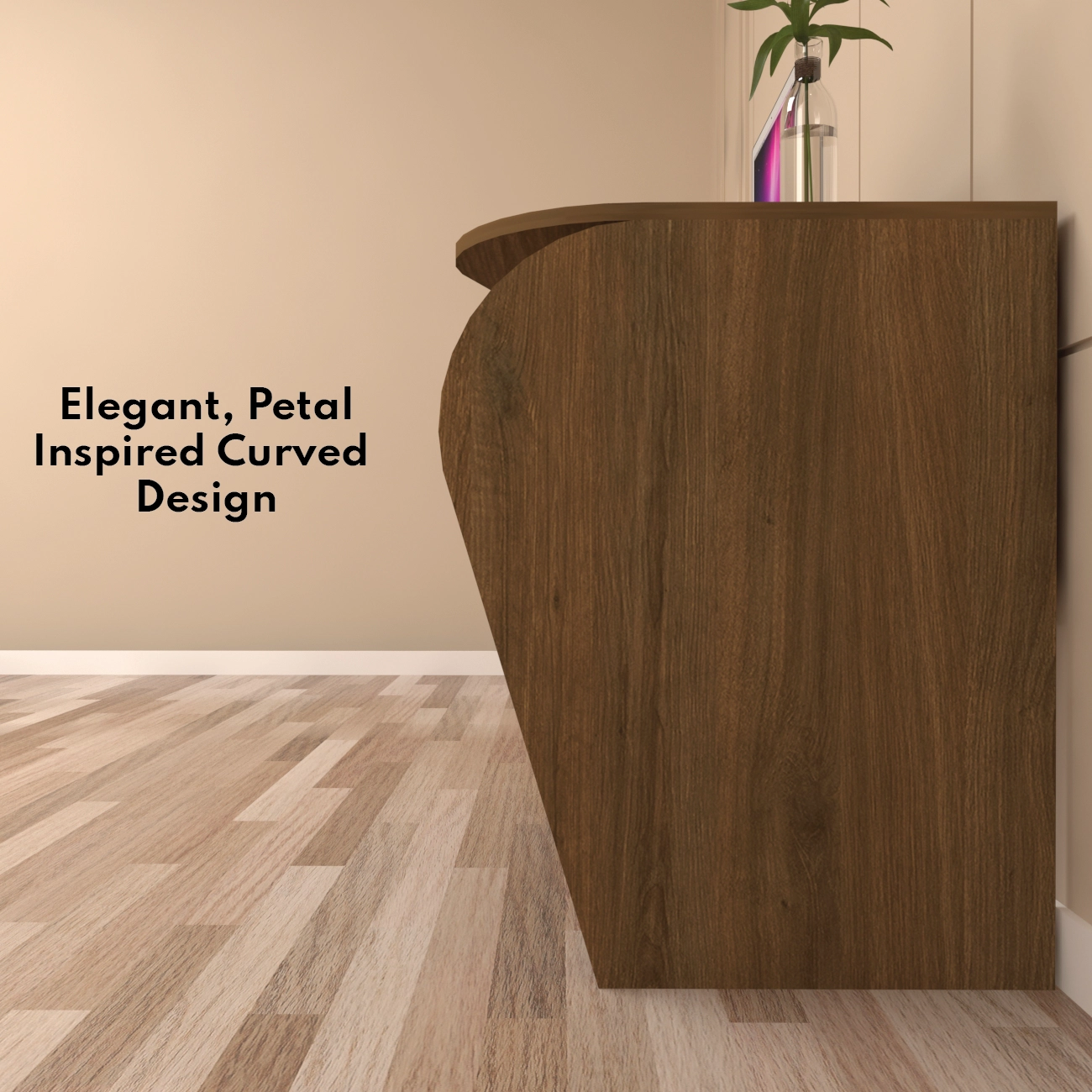 Floro study table stands out with its unique, petal-inspired curved design that not only adds a touch of elegance but also enhances functionality. It features a dynamic depth that starts at 45 cm and extends to 59.5 cm, accommodating various work or study related activities. The table spans 107.5 cm in length and stands at a height of 77 cm, providing a spacious work surface suitable for multitasking in any office or study area. Crafted from premium engineered wood, this table ensures durability and stability while maintaining a sleek, modern aesthetic. It includes four integrated shelves beneath the work surface, offering ample storage for books, office supplies, and decorative items, keeping essentials organized and within easy reach. Additionally, a built-in cable organizer helps maintain a neat and clutter-free workspace by managing all wires and cables effectively.