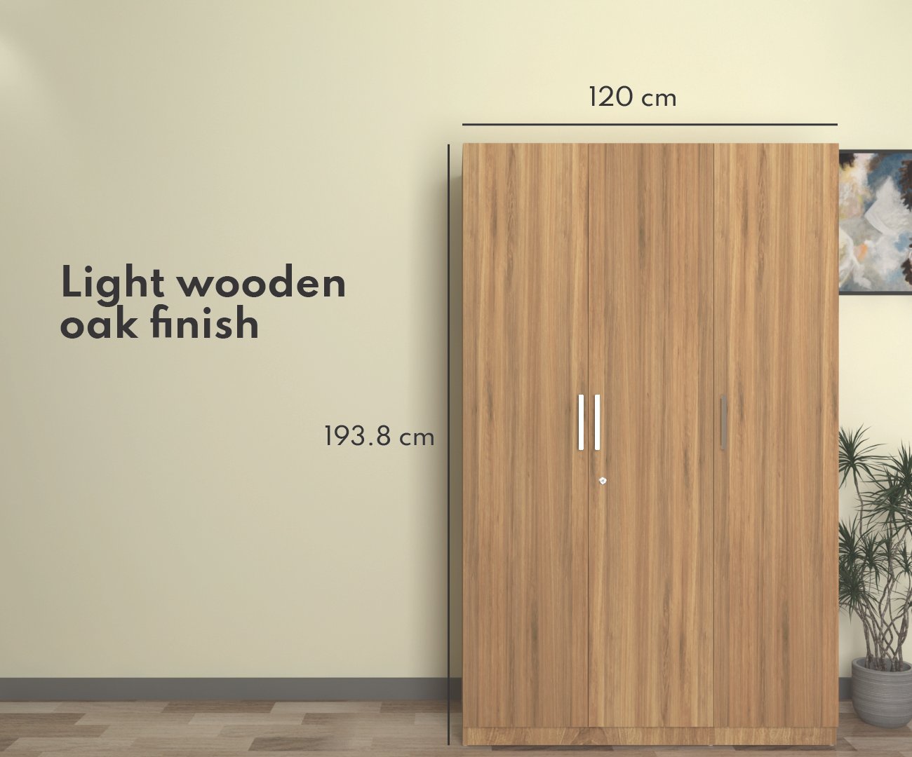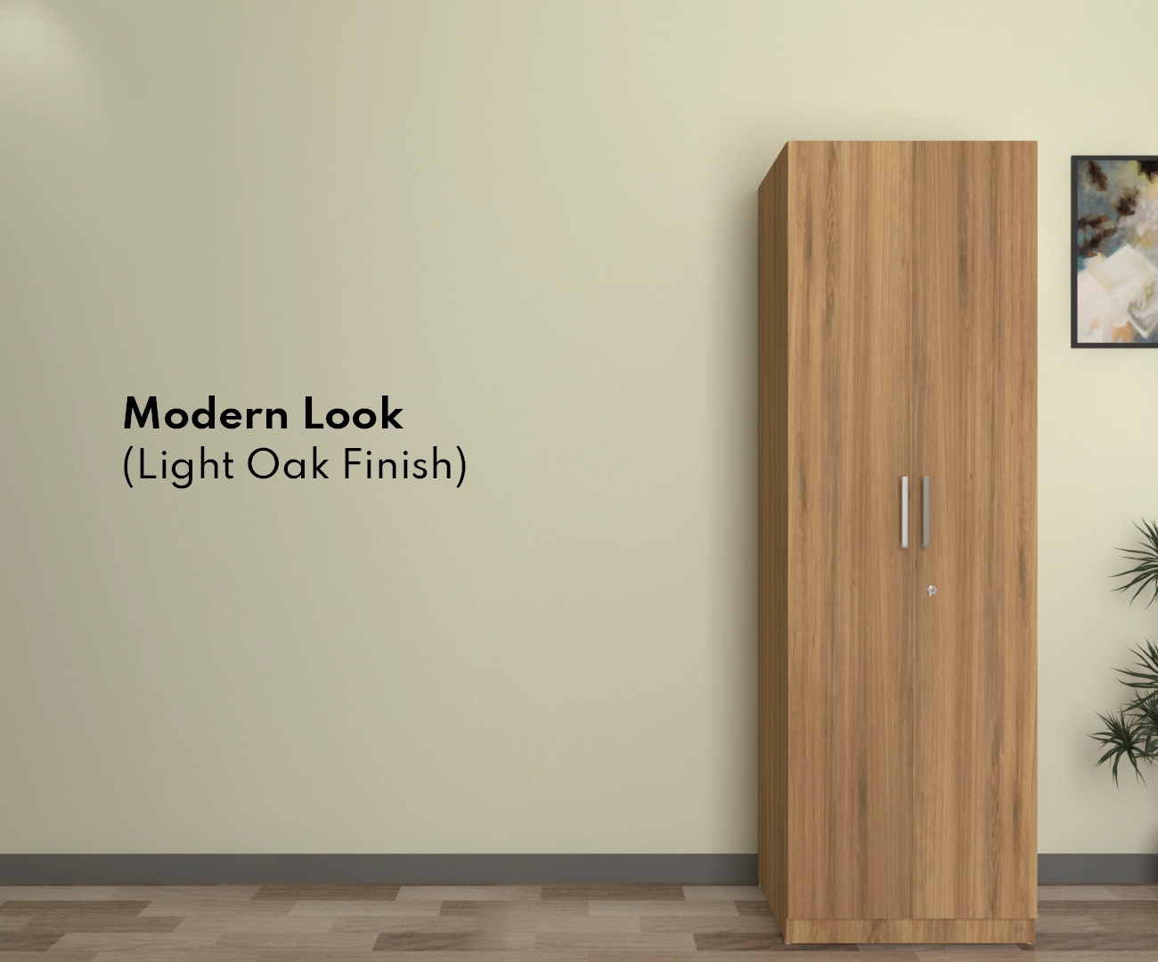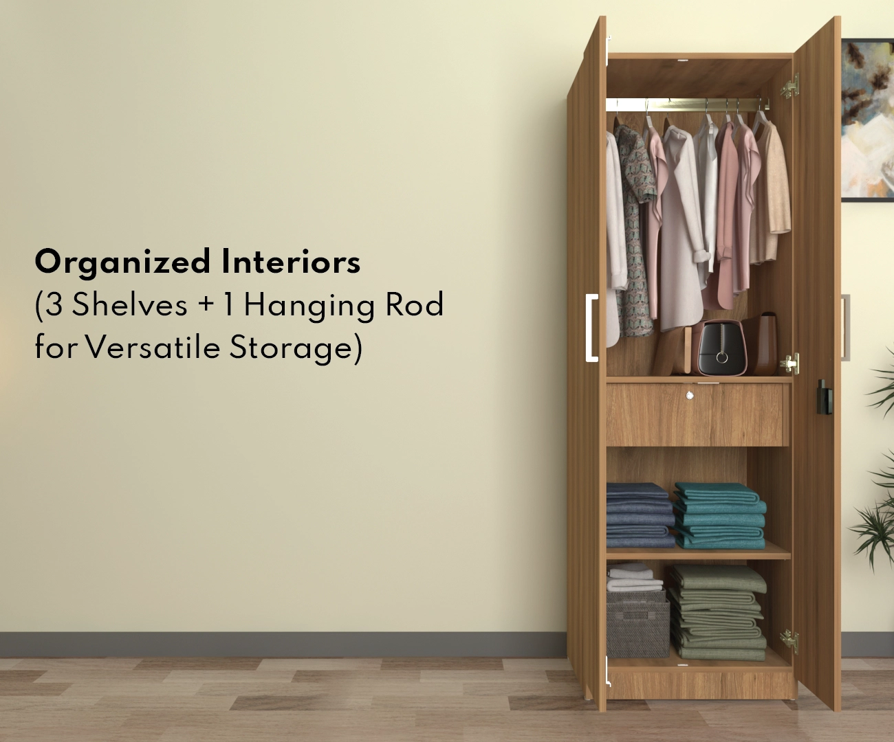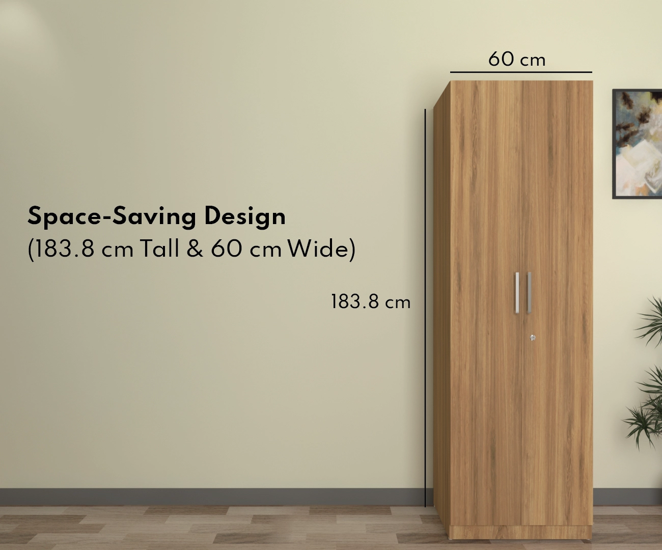 Hectra 2 door smart wardrobe from spacesbyU is designed to combine style, functionality, and premium quality. Crafted from E2-grade premium engineered wood as per European standards, this wardrobe is eco-friendly & stylish. Its light wooden oak finish complements contemporary interiors, while its robust construction ensures enduring quality. Sized at 183.8 cm (72 in) in height and 60 cm (23.6 in) in width, the wardrobe fits seamlessly into contemporary homes while providing ample storage. The interior layout of this cabinet is designed with three shelves and one hanging rod, offering versatile storage for folded and hanging clothes or to keep inside organizers or boxes.
