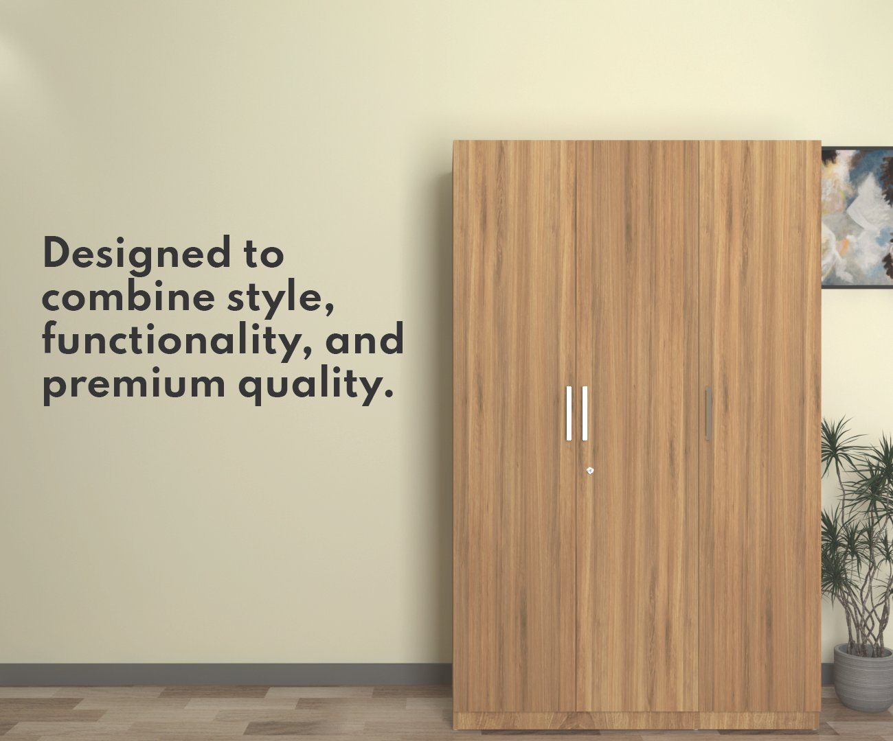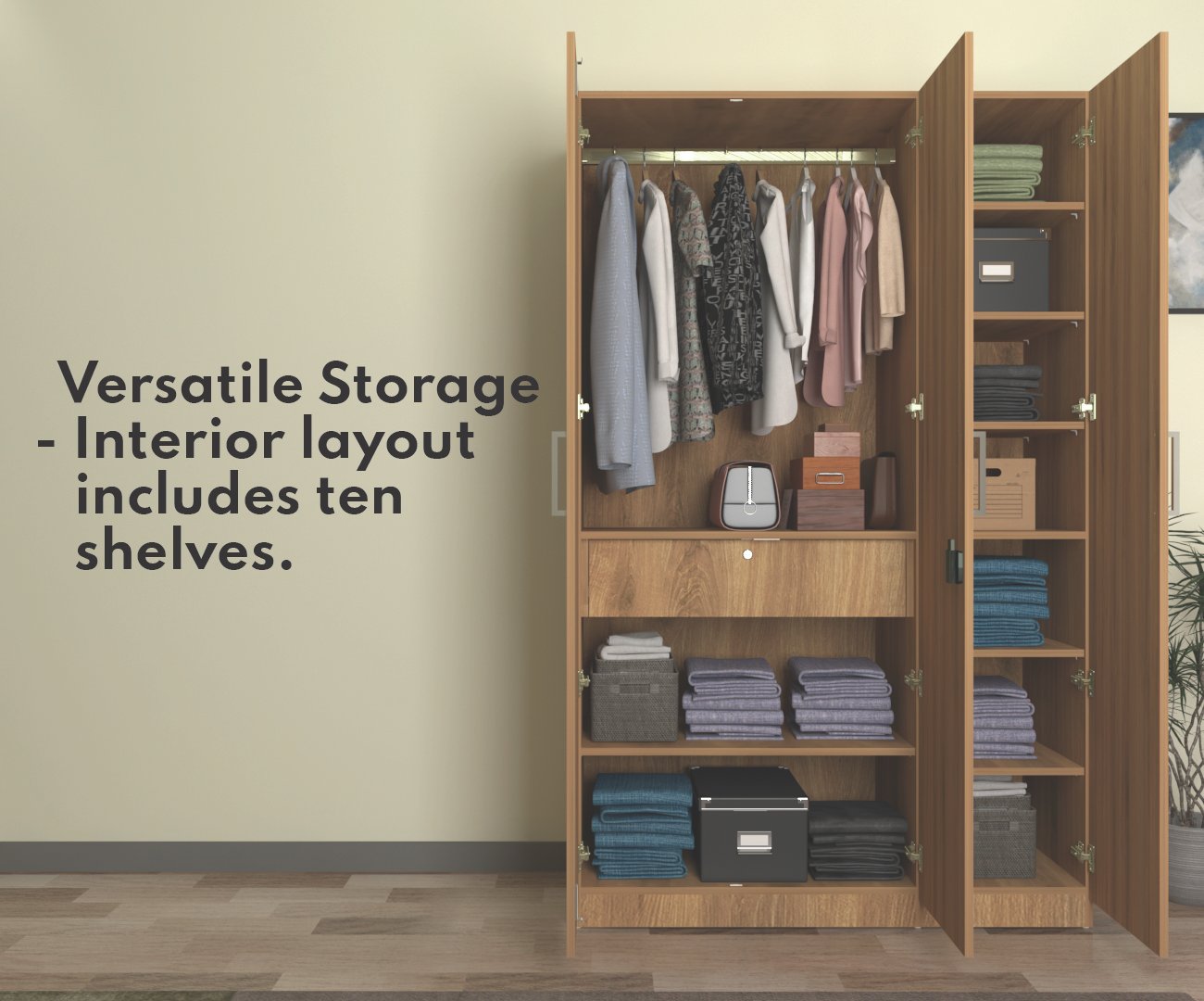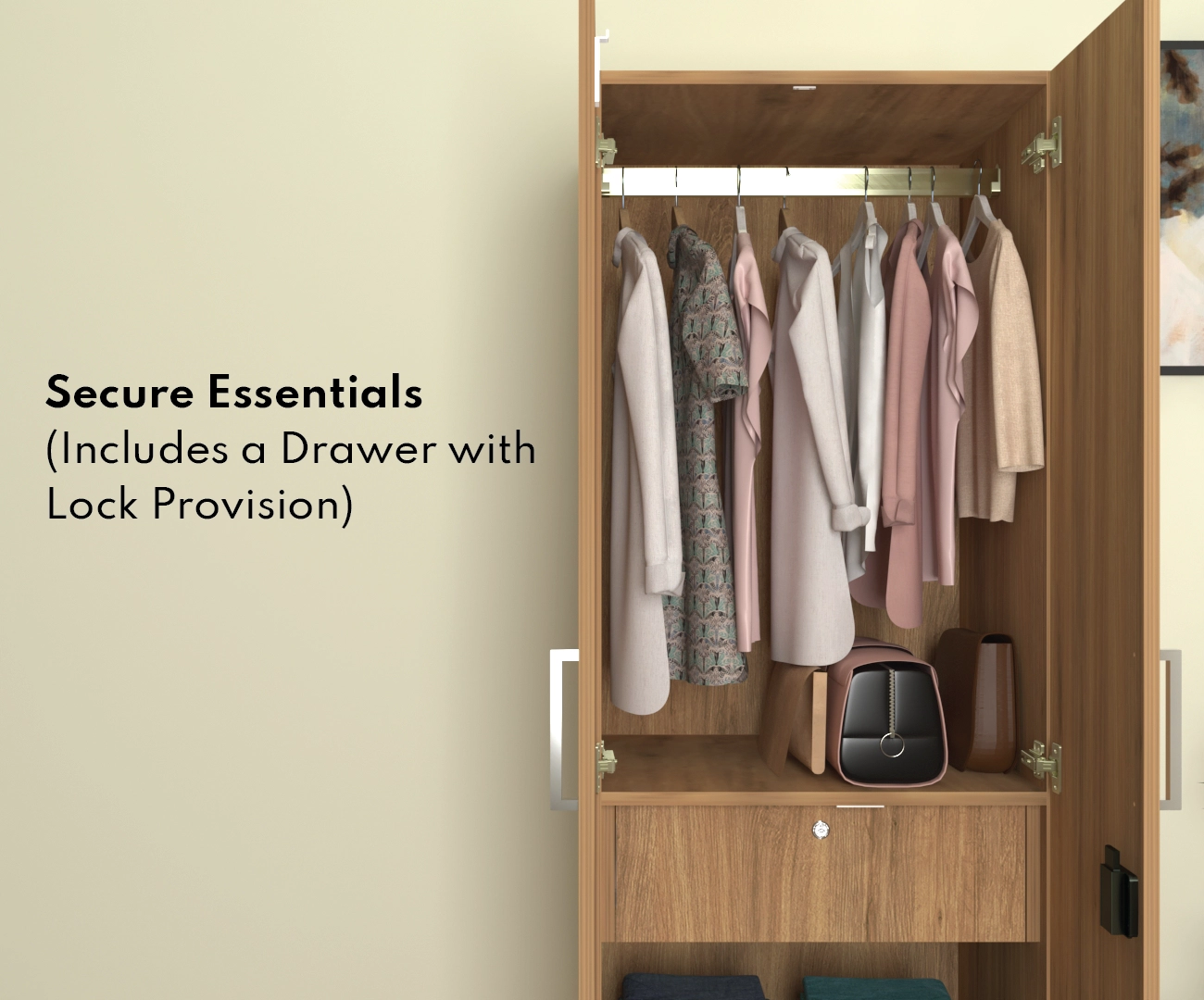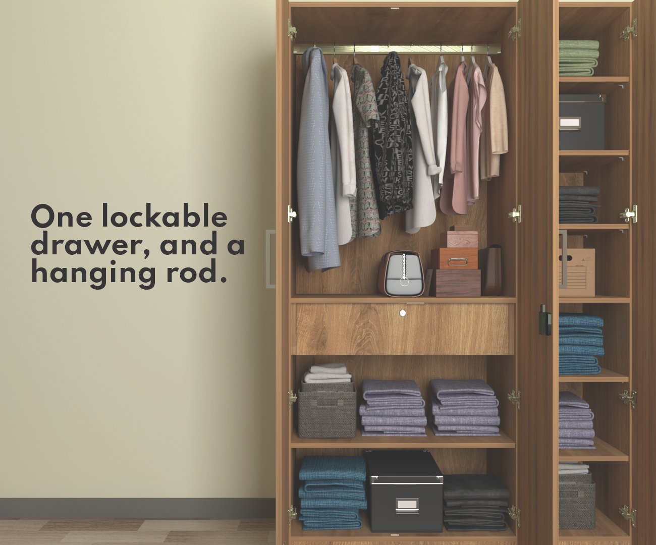 The cupboard has 1 drawer with lock provision to secure essentials. The 17mm thick door panels and shelves provide superior strength, ensuring stability and long-lasting performance.The 17mm thick door panels and shelves provide superior strength, ensuring stability and long-lasting performance. With dual door stoppers and a 7-lever metal lock, it offers maximum security for your personal items.