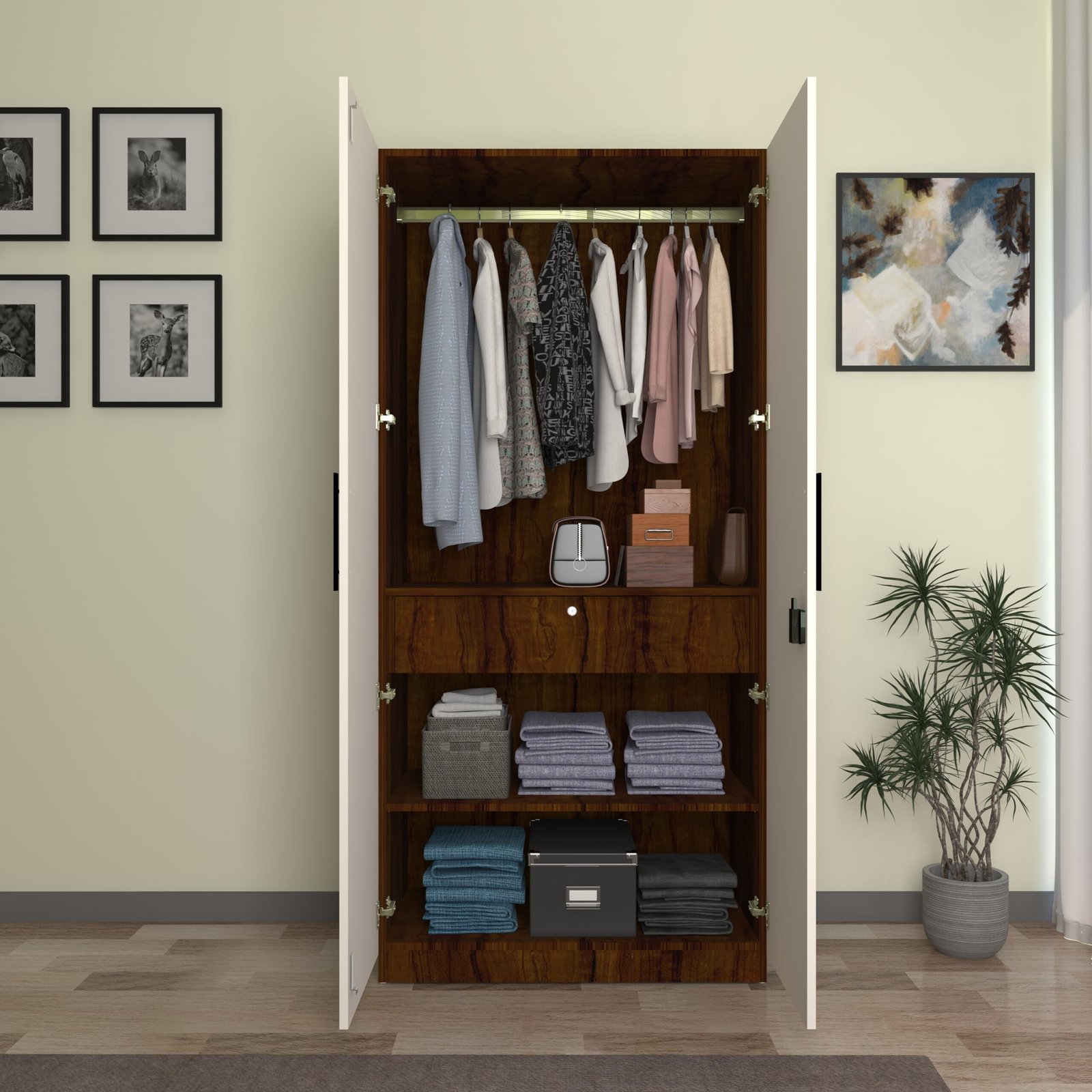 Hectra Wardrobe – 2 Door | Cupboard | Almirah with 3 Shelves, Soft-Close Hinges, & Hanging Rod | Colour – Brazilian Walnut & Frosty White