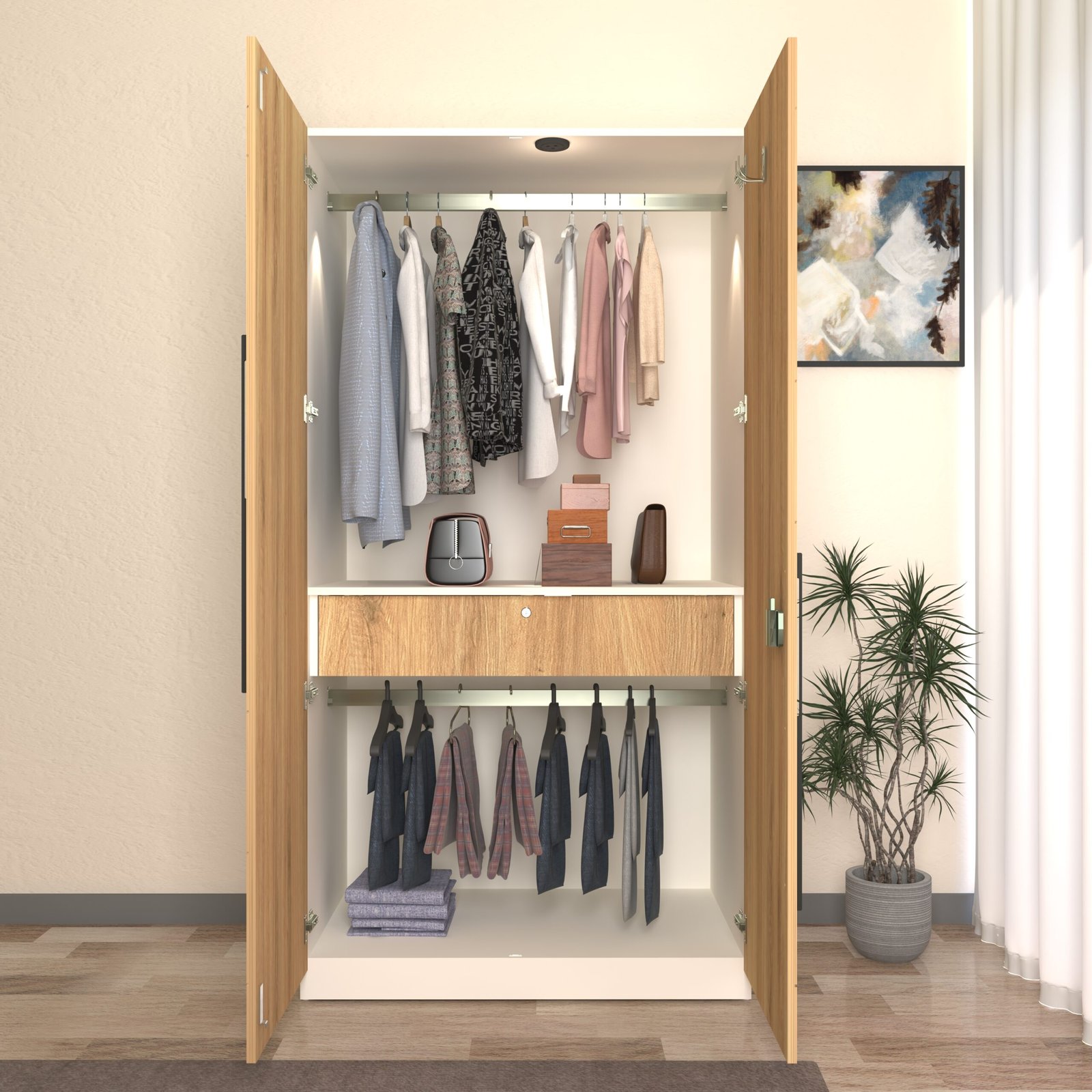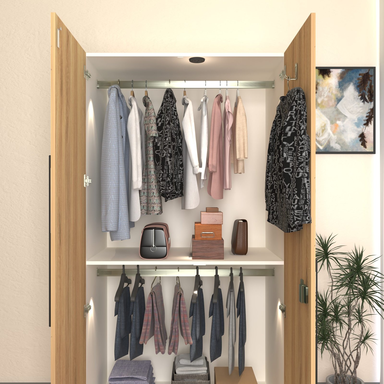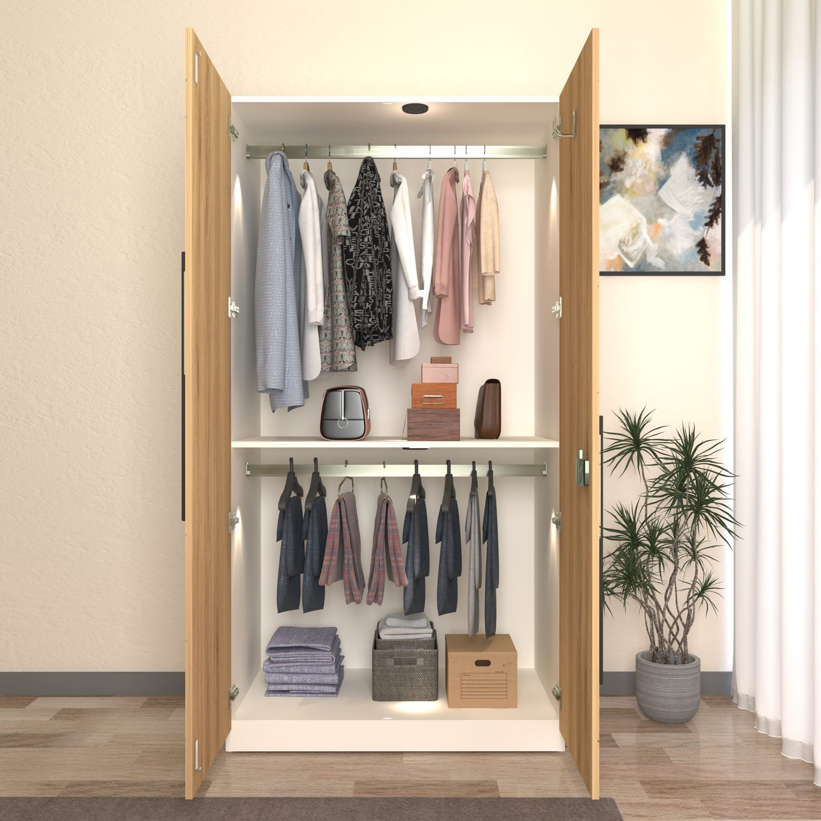 Upgrade your bedroom with the Keris Premium 2-Door Wardrobe, designed in a stylish Wood Oak Light & Frosty White dual-tone finish that complements all modern interiors. Built from durable engineered wood, this wardrobe offers a clean, spacious layout with one full-length hanging section and one large lower storage area.