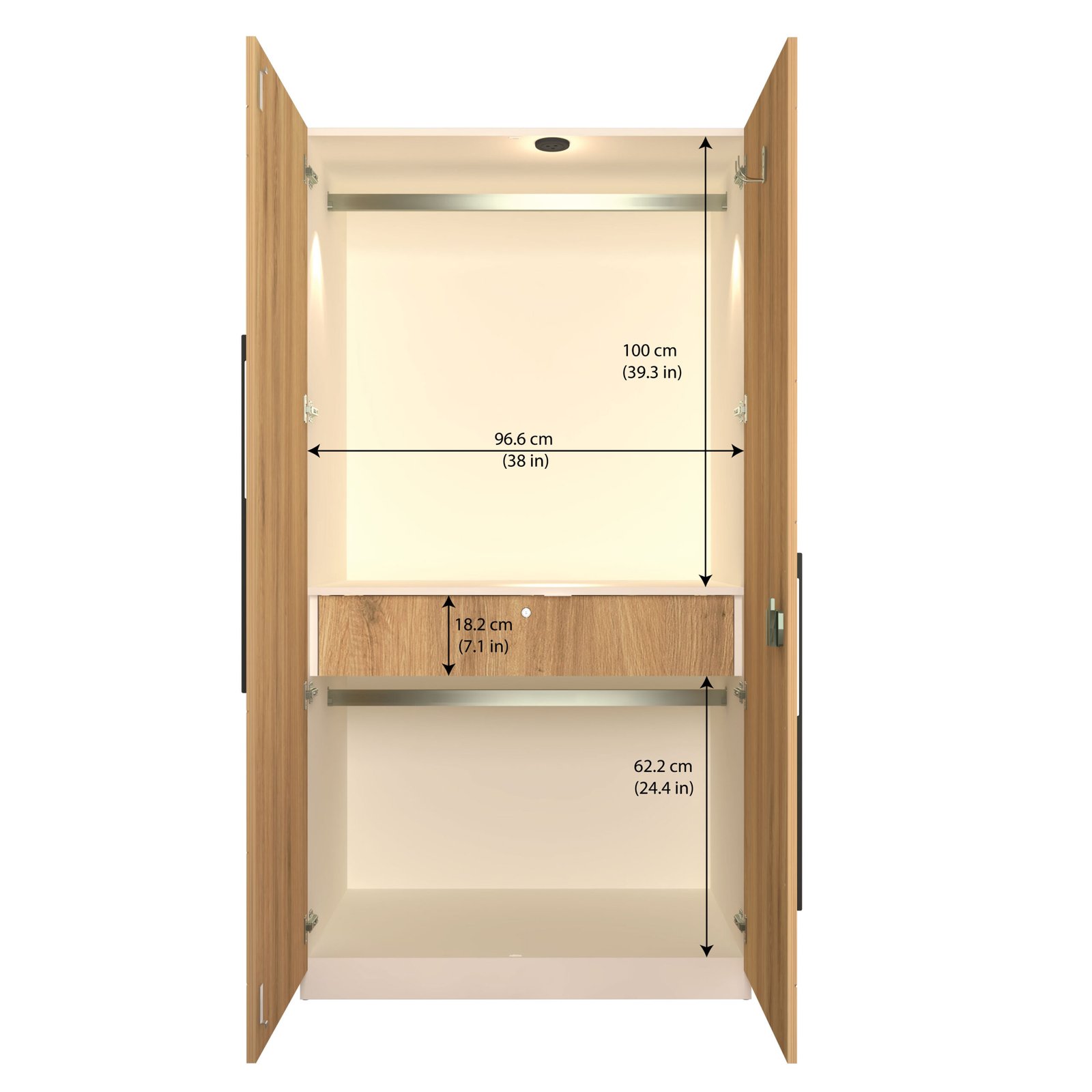 The main hanging area measures 100 cm (H) × 96.6 cm (W) and includes a sturdy metal hanging rod for shirts, dresses, coats, and daily wear. Beneath it, the wardrobe provides a large 80.4 cm (H) storage zone along with a single utility shelf, ideal for folded clothes, bags, boxes, and accessories.