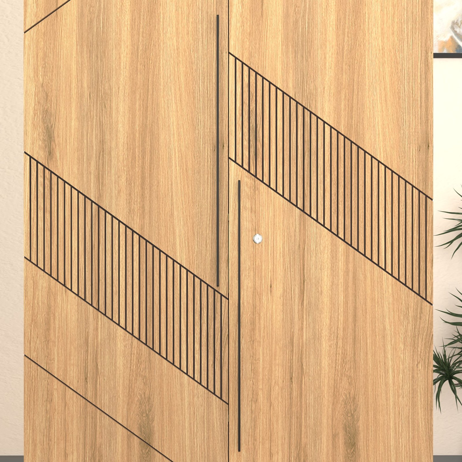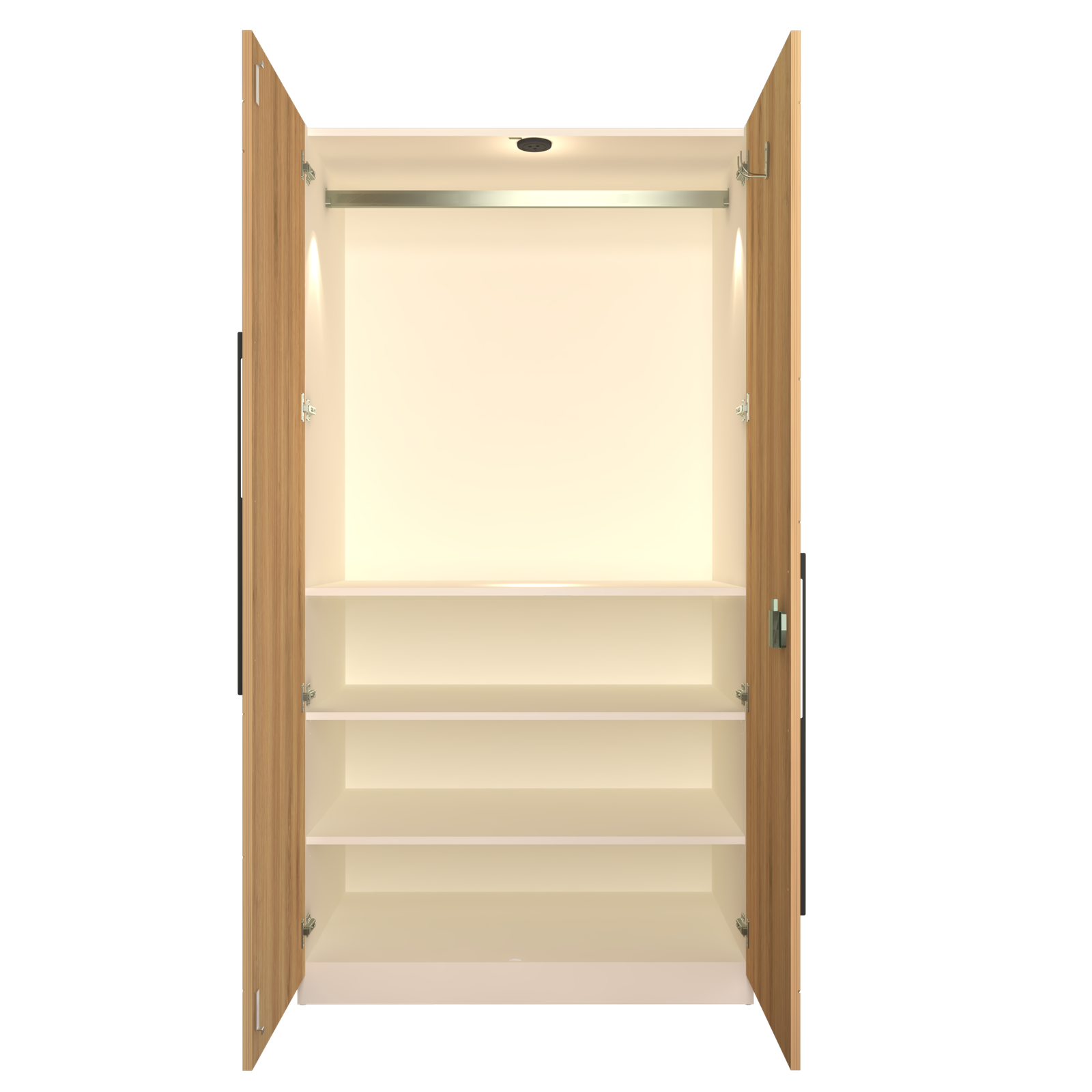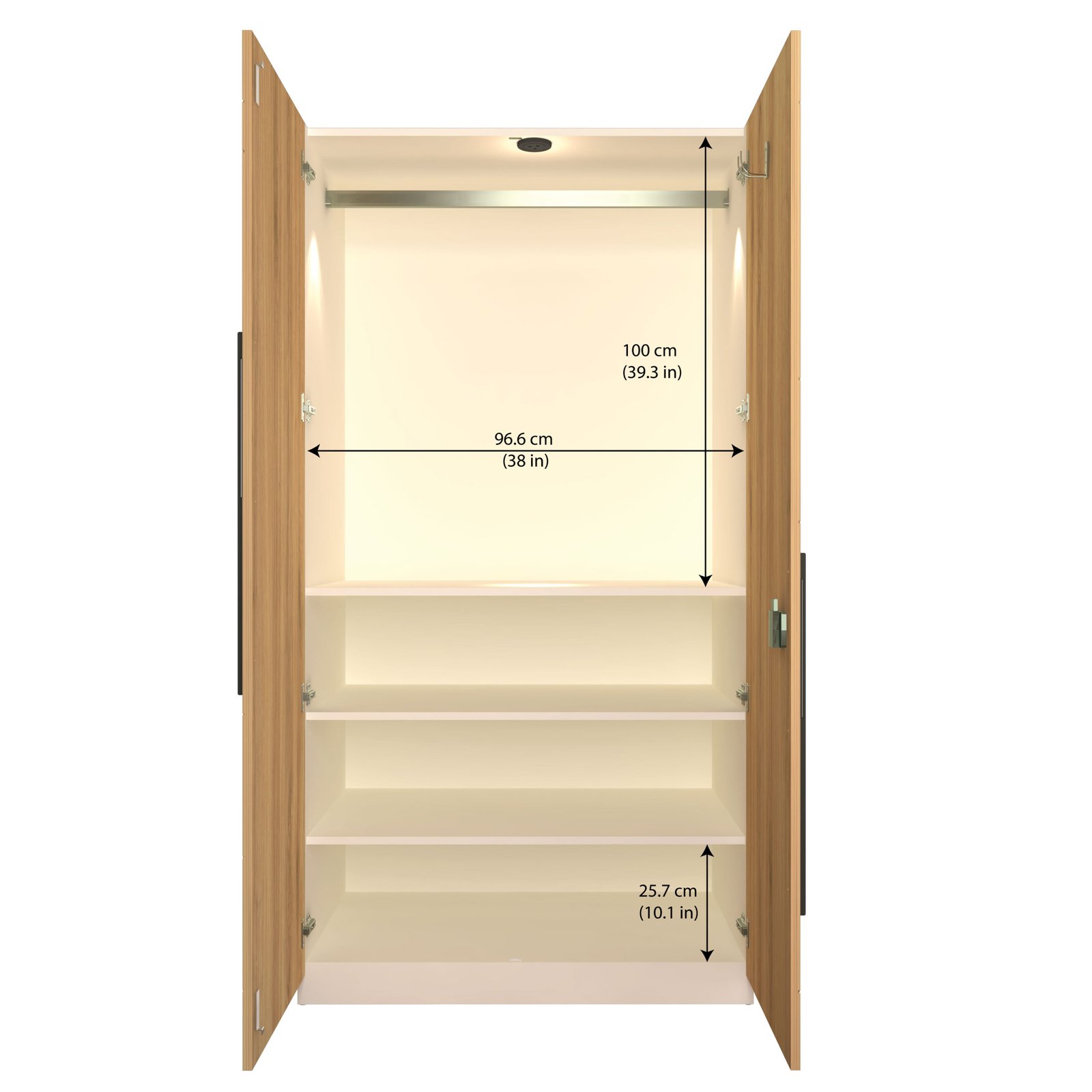 Enhance your bedroom storage with the Kiano Premium 2-Door Wardrobe, crafted in an elegant Wood Oak Light & Frosty White dual-tone finish that elevates any modern interior. Built from high-grade engineered wood and premium MDF shutters, this wardrobe offers a strong, durable, and spacious layout designed for everyday functionality. The upper section features a full-width hanging space measuring 100 cm (H) × 96.6 cm (W) with a sturdy metal hanger rod—ideal for shirts, kurtas, dresses, coats, and daily wear. Below the hanging zone, the Kiano wardrobe includes three spacious utility shelves, with the bottom shelf offering 25.7 cm (H), perfect for folded clothes, bags, storage baskets, and accessories. For convenience and visibility, the wardrobe includes a motion-sensor LED light that instantly illuminates the interior when the doors open. Premium hardware, soft-close hinges, and stylish long metal handles ensure smooth operation and modern aesthetics. Ideal for compact and contemporary bedrooms seeking smart, organised, and stylish storage. With 17mm thick panels, 24-inch designer profile handles, a sturdy 7-lever lock, dual door stoppers, and an accessory peg for belts or scarves, the kiano Wardrobe delivers the perfect blend of security, style, and practicality for modern homes. <br Note: AAA Batteries for the Sensor LED light are not included.