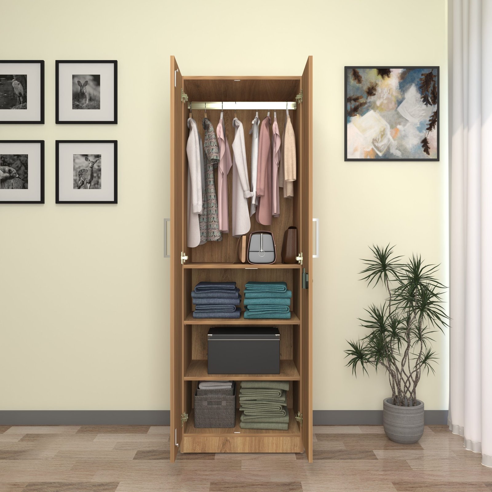Kiano 2 door smart wardrobe from spacesbyU is designed to combine style, functionality, and premium quality. Crafted from E2-grade premium engineered wood as per European standards, this wardrobe is eco-friendly & stylish. Its light wooden oak finish complements contemporary interiors, while its robust construction ensures enduring quality. Sized at 183.8 cm (72 in) in height and 60 cm (23.6 in) in width, this spacious cupboard fits seamlessly into contemporary homes while providing ample storage.