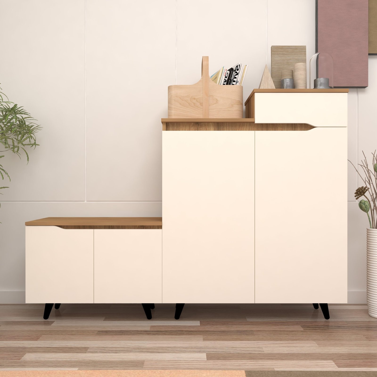 The designer black metal legs elevate the shoe rack for easy cleaning underneath while adding a stylish contrast. A built-in left side seating area adds convenience and maximizes utility—ideal for putting on or removing shoes comfortably without needing separate furniture.