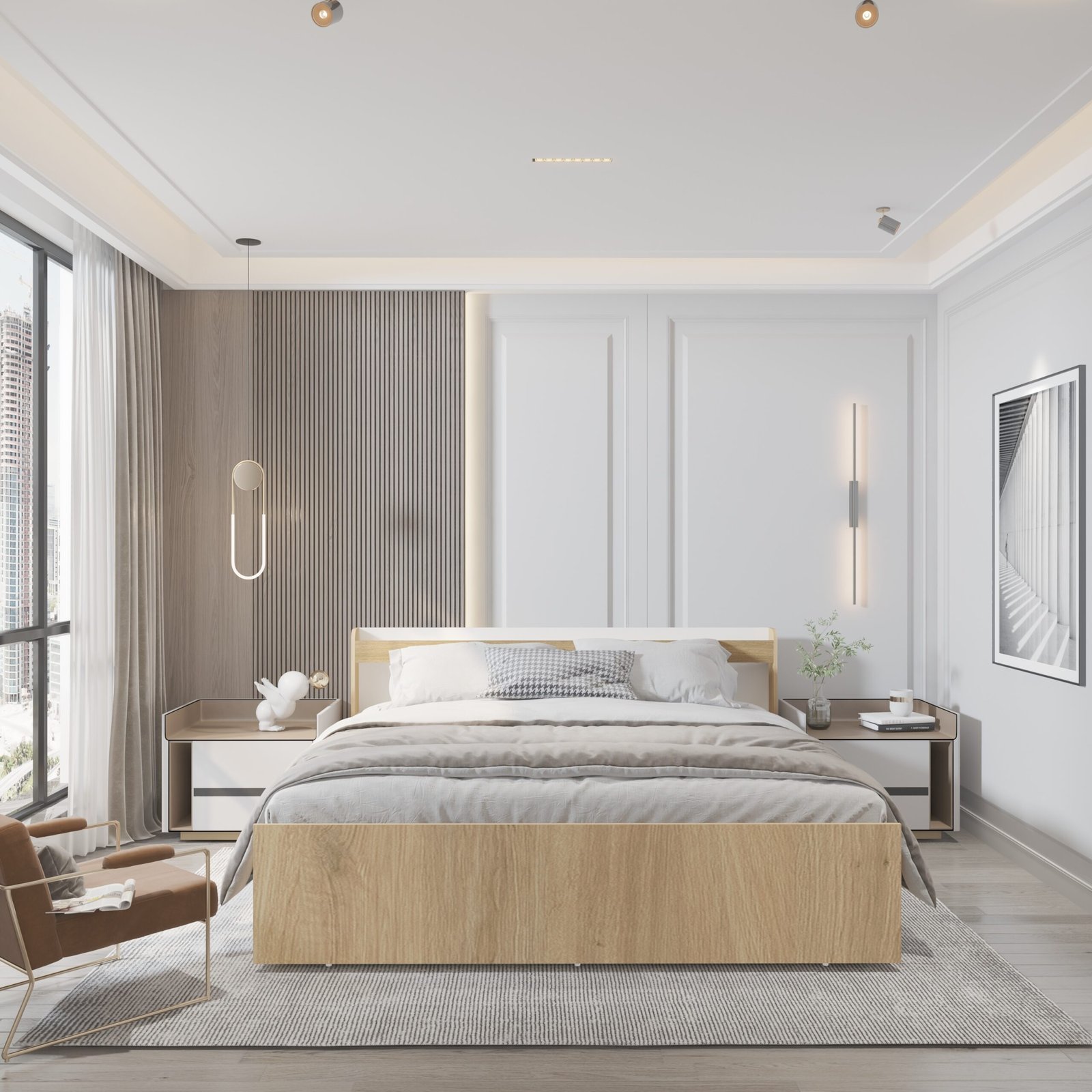 The Lunor Bed is a perfect combination of minimalist design, modern functionality, and premium craftsmanship. Finished in a soothing blend of Light Oak Wood and Frosty White, this platform bed brings warmth, elegance, and contemporary charm to any bedroom. Its clean lines and subtle design details make it ideal for minimalist, and modern interior styles.
