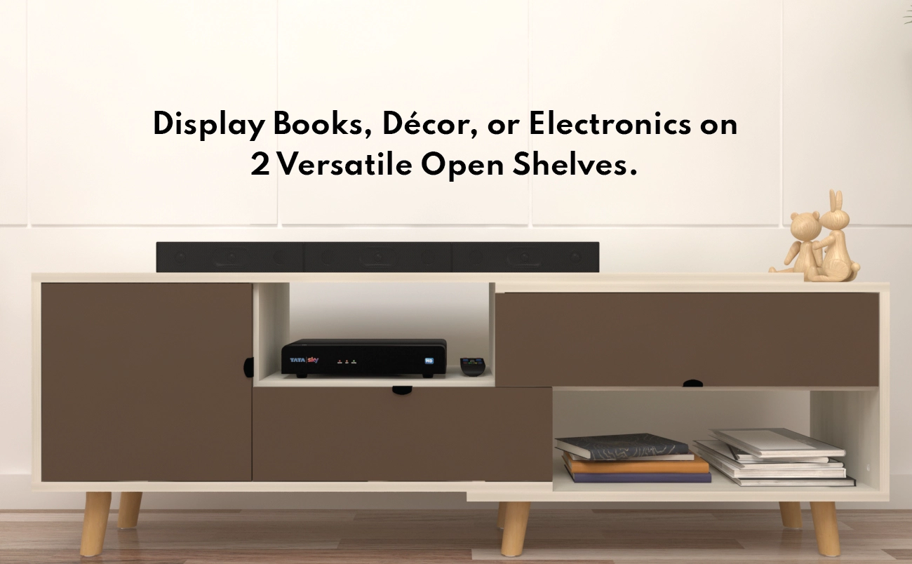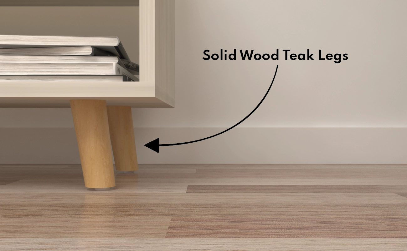 Innovative Storage: Equipped with two spacious drawers, each featuring designer handles for a modern touch, and one hinged door cabinet, this TV unit offers ample storage for all your multimedia needs. Versatile Shelving: Two open shelves provide the perfect space to organize electronics, display books, or curate decorative items, making it as functional as it is stylish. Robust Support: The entire structure is supported by six solid wood teak legs, which provide a strong and stable foundation for the unit, giving peace of mind for the safety of your electronics and display items.
