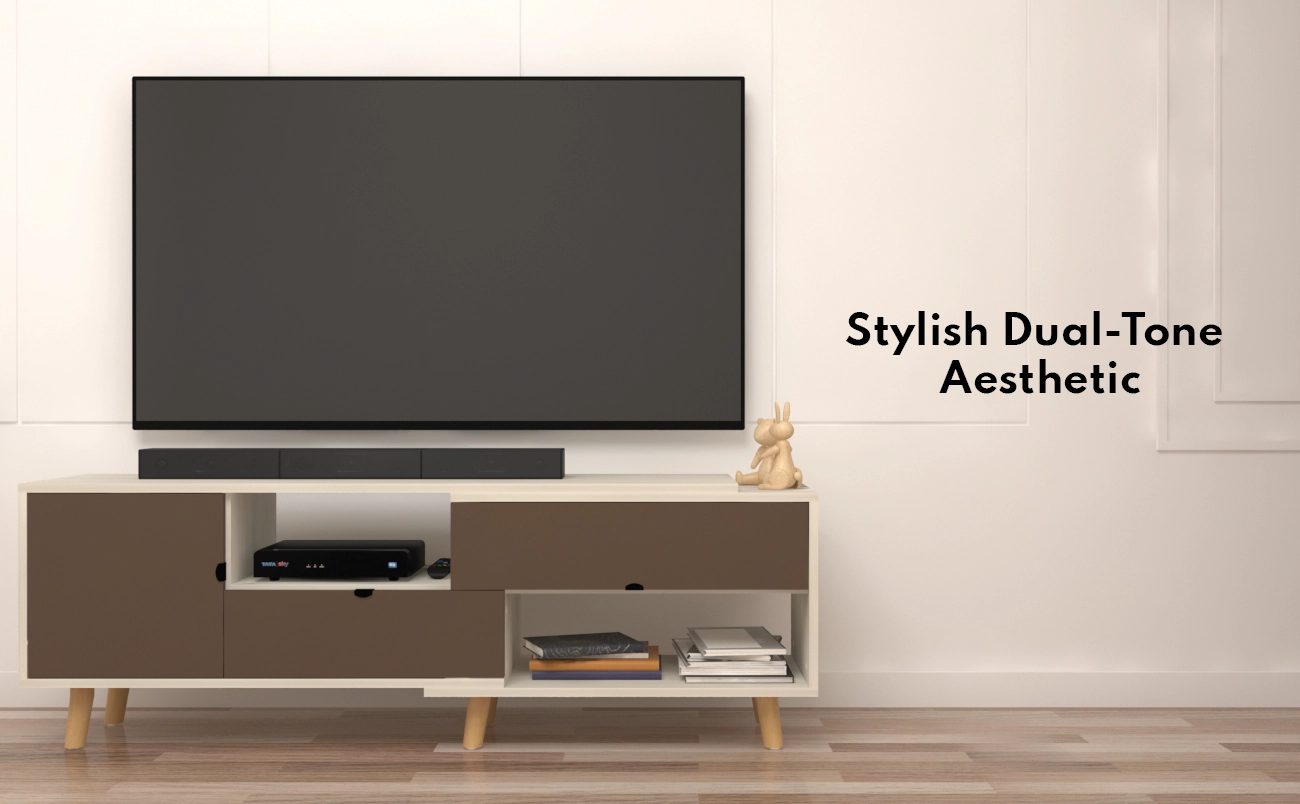 The Nuaro TV Unit stands as the pinnacle of modern design and functionality, tailored for both living and bedroom space. Stylish Dual-Tone Aesthetic: The tv unit boasts a chic combination of mocha brown and acacia light, adding a contemporary touch to your living or bedroom space. Spacious Design: With a width of 150 cm (59 inches), a height of 51.4 cm (20 inches), and a depth of 35.5 cm (13.9 inches), it supports TV sizes up to 65 inches, making it ideal for a range of living room sizes. High-Quality Construction: Made from premium engineered wood, the tv unit not only provides durability but also ensures that it is built to last and maintain its elegant appearance over time.