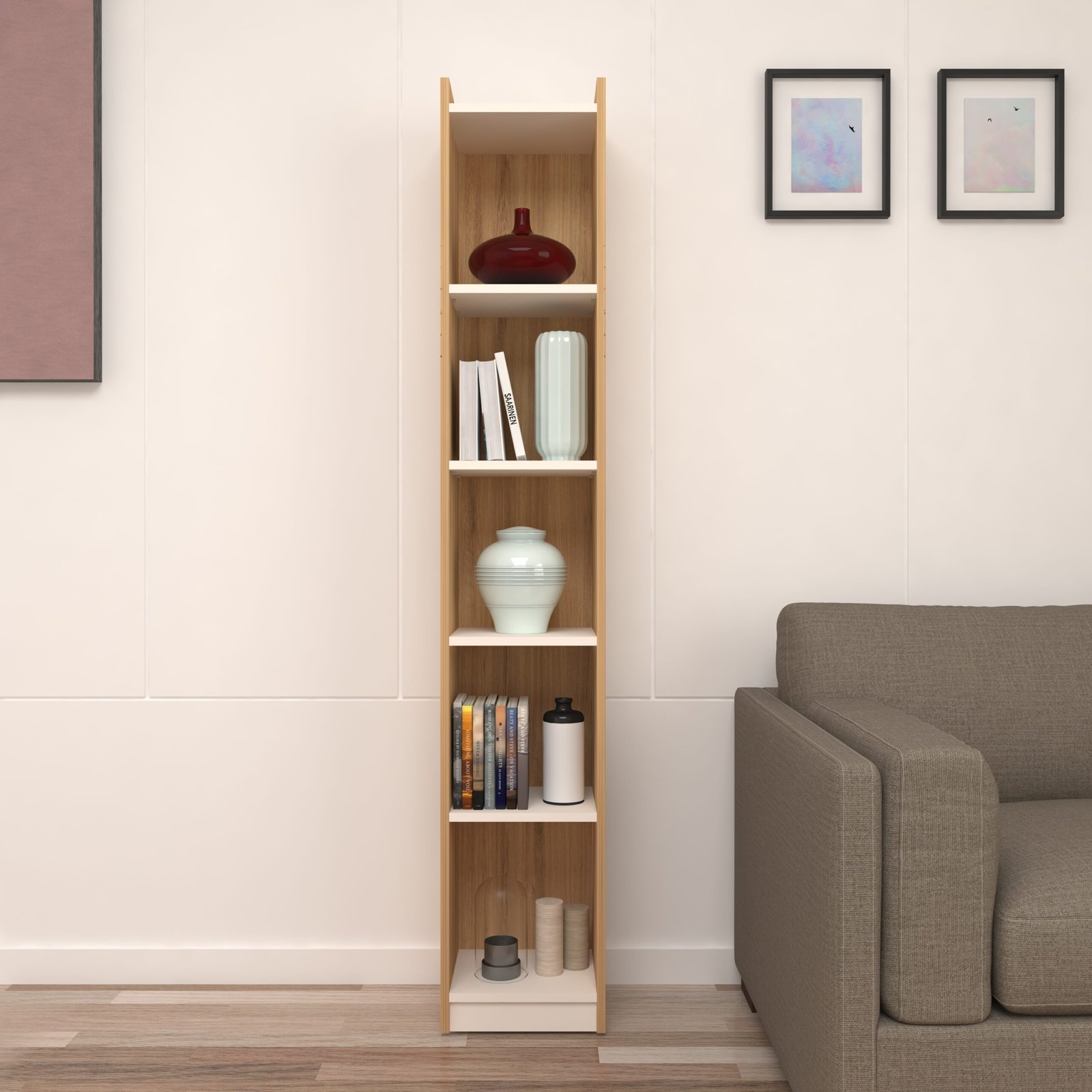 Upgrade your home organization with the Oaktiva Slim 6-Tier Display Unit, a modern wooden display rack crafted in an elegant Light Wood Oak and Frosty White finish. Designed for compact spaces, this tall narrow display unit offers vertical storage without occupying extra floor area.