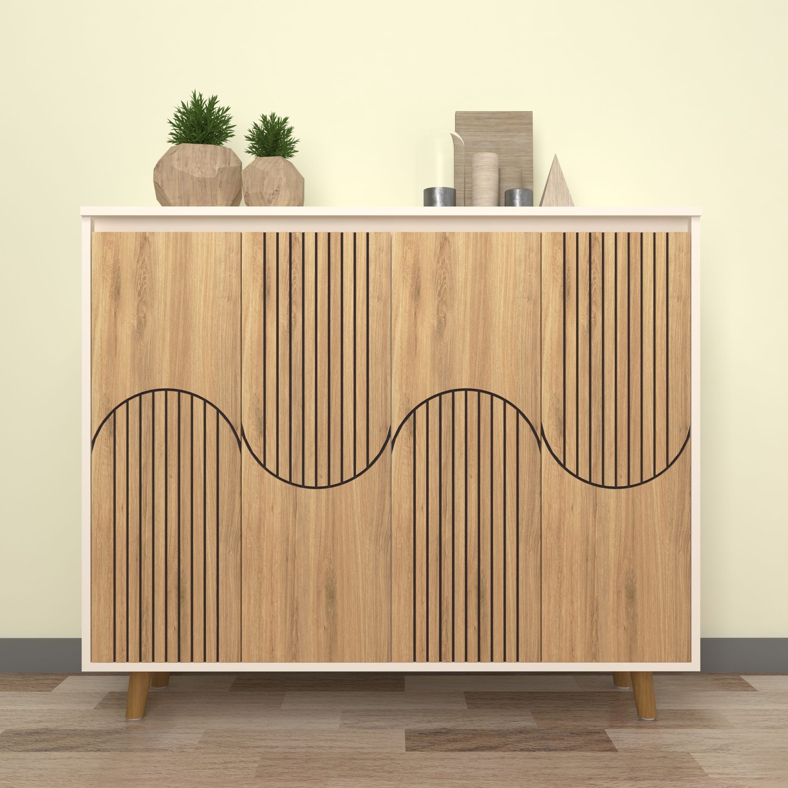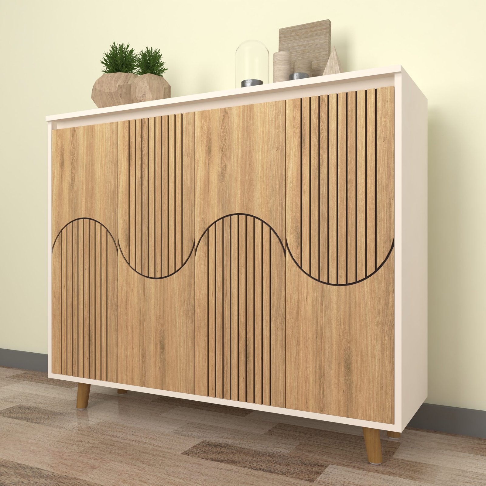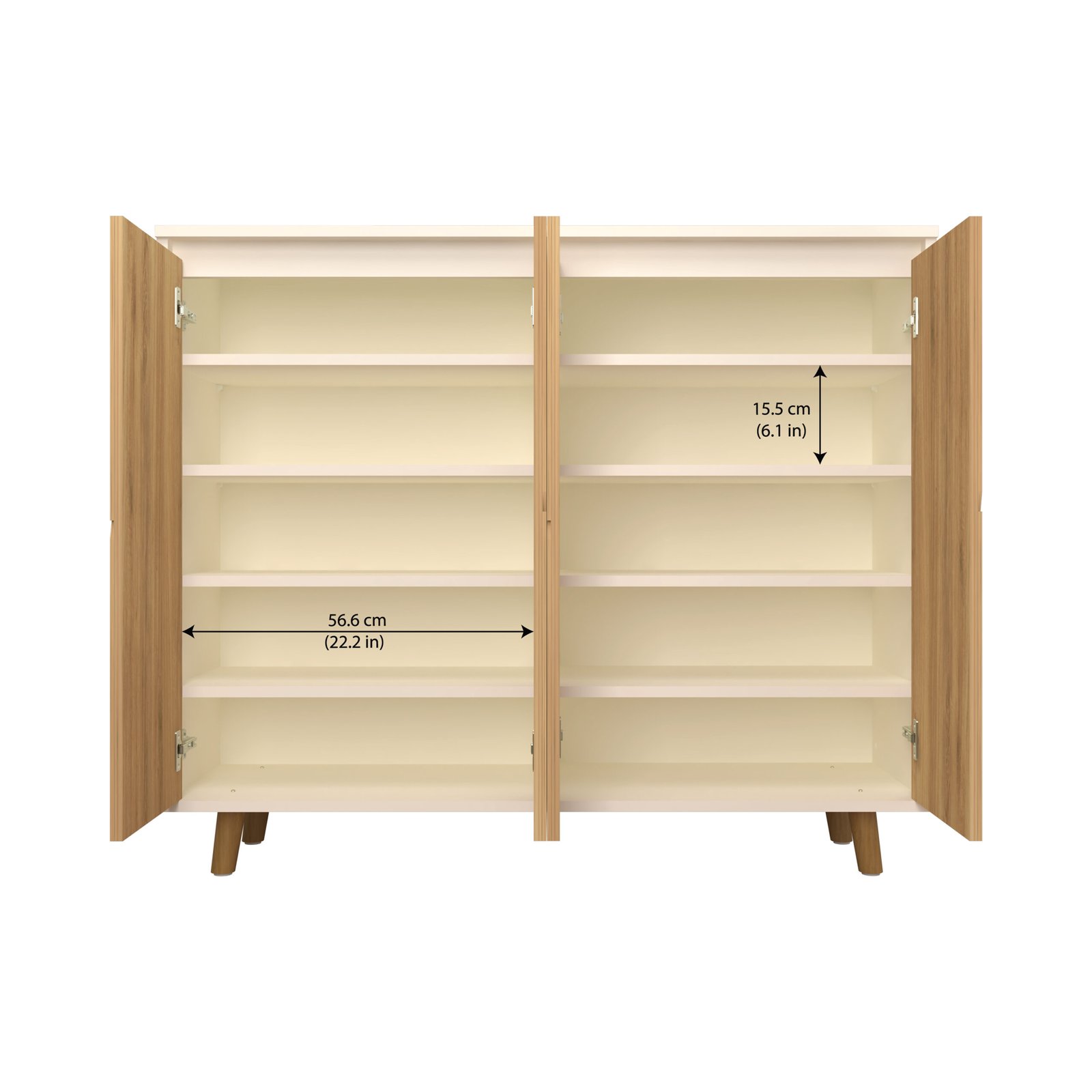 The highlight of the design lies in its premium designer shutter doors, detailed with vertical grooves and a flowing wave-pattern accent that adds depth, texture, and contemporary character. Behind the shutters, thoughtfully spaced internal shelves provide organised storage for up to 30 pairs of shoes, keeping them protected from dust and visual clutter. Finished with sturdy raised legs for enhanced stability and easy floor cleaning, the Octaro shoe rack is a perfect balance of style, structure, and everyday practicality.