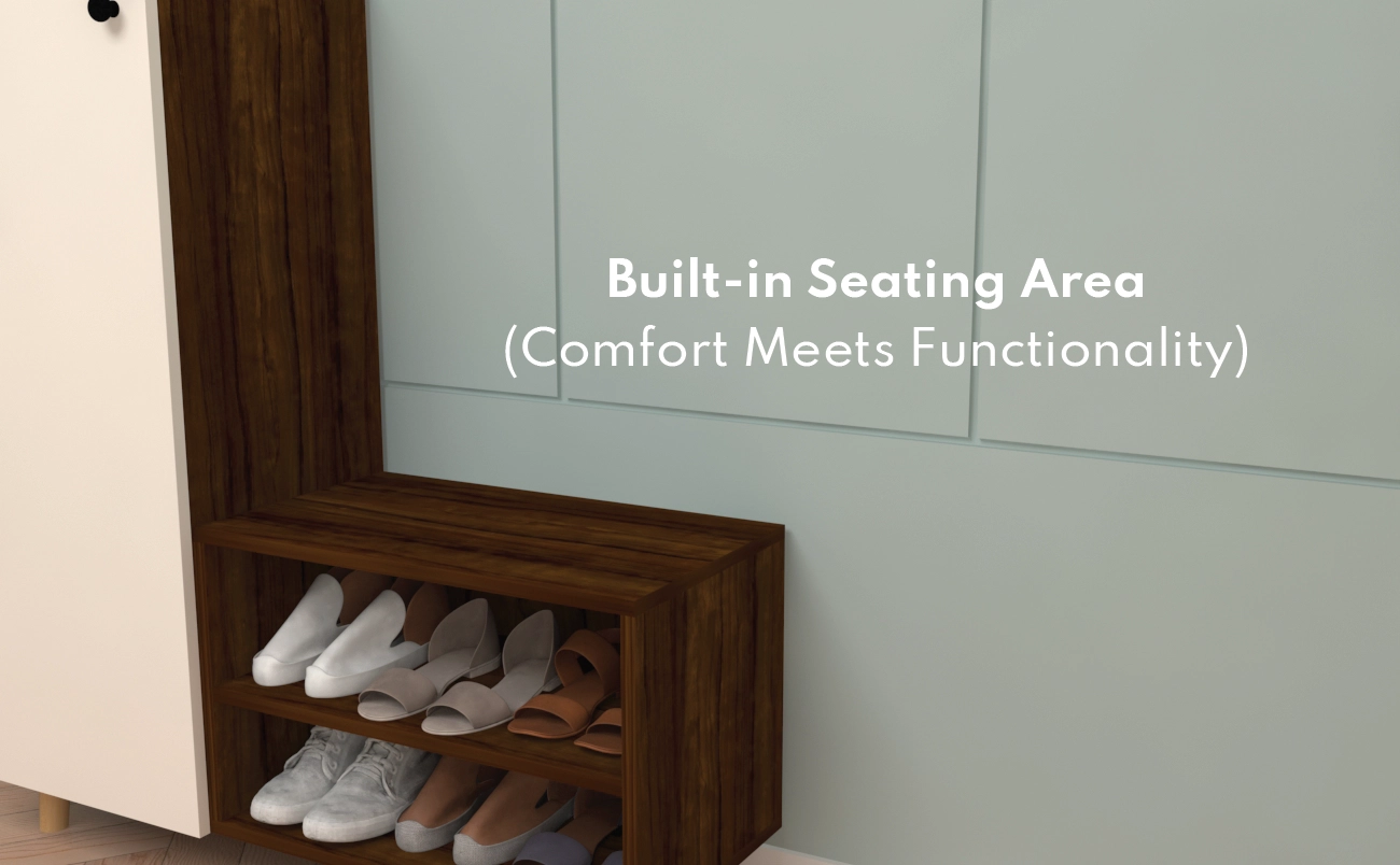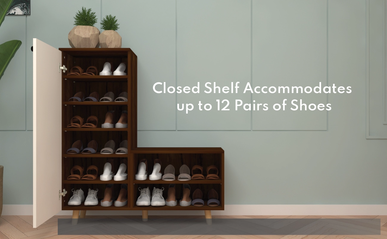 Tifoh Shoe Rack offers a smart blend of style and functionality with its unique combination of open and closed storage. Store up to 18 pairs of shoes—6 pairs in two open shelves for quick daily access and 12 pairs in six adjustable closed shelves. A dedicated seating area enhances usability, while the top surface adds room for décor or daily essentials like keys.