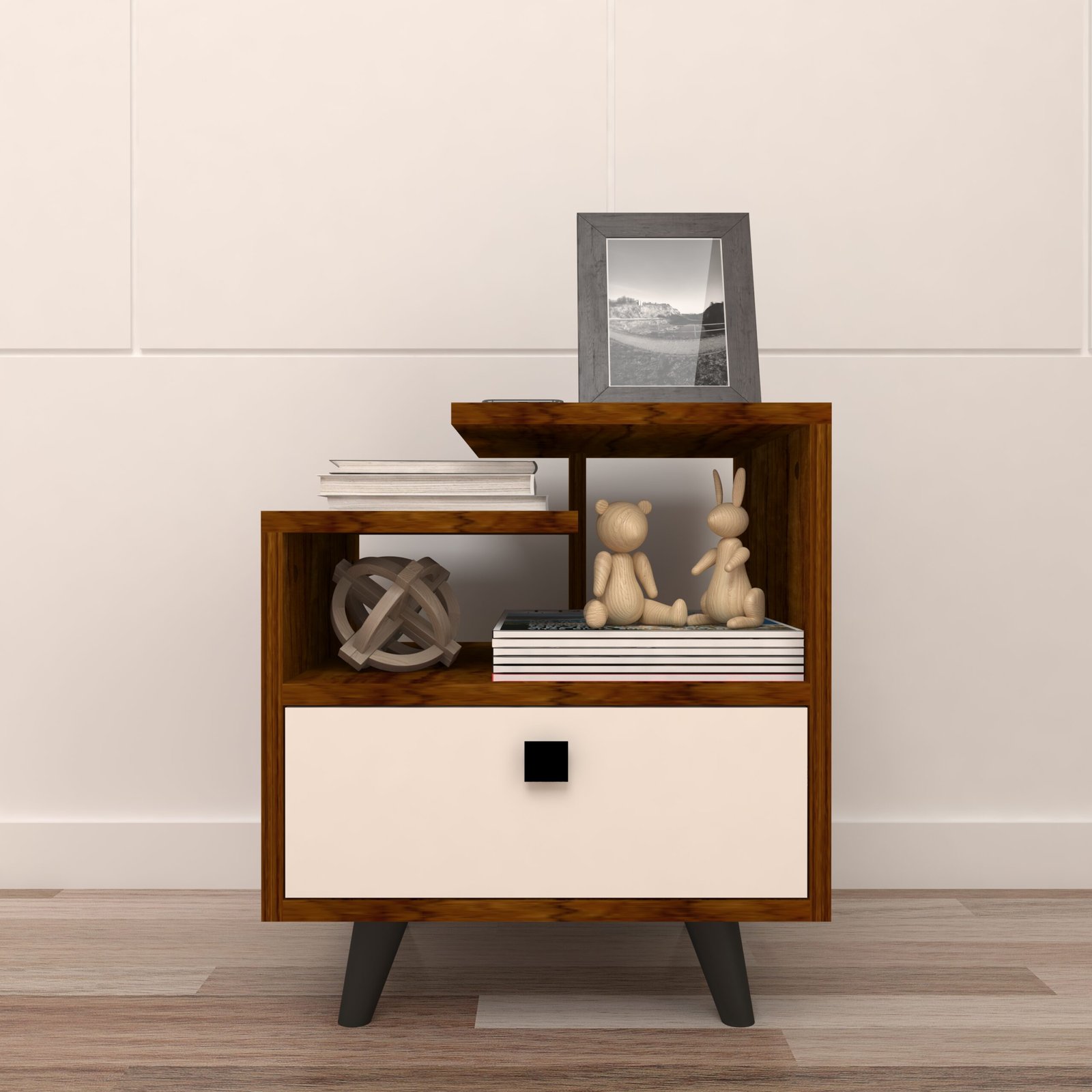 Add a touch of modern charm to your home with the Vrenlo side table, a perfect blend of style and practicality. Designed with a dual-tone Brazilian Walnut and Frosty White finish, this table enhances the elegance of any living or bedroom space. Crafted from premium engineered wood (particle board), it ensures long-lasting durability with a refined, contemporary look.