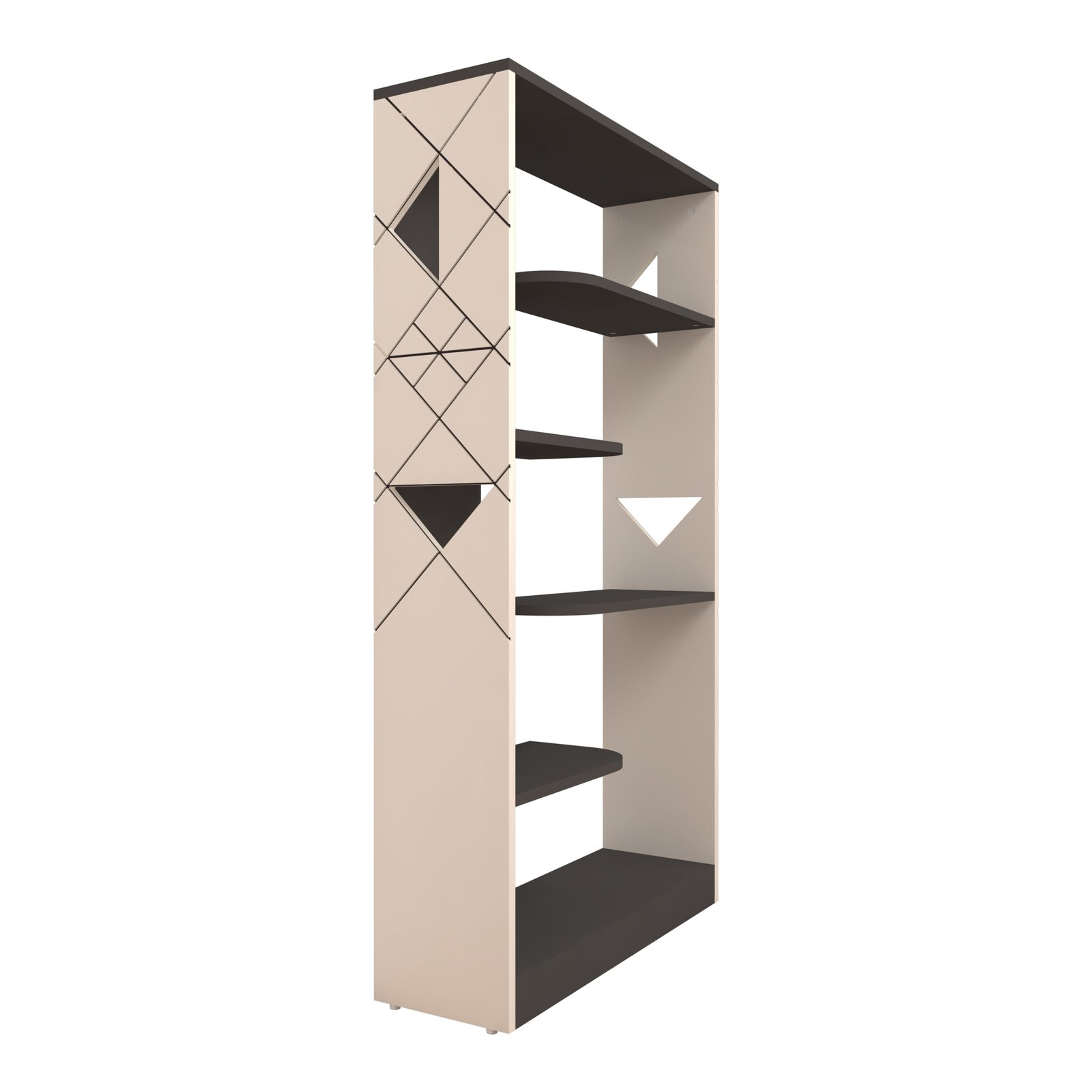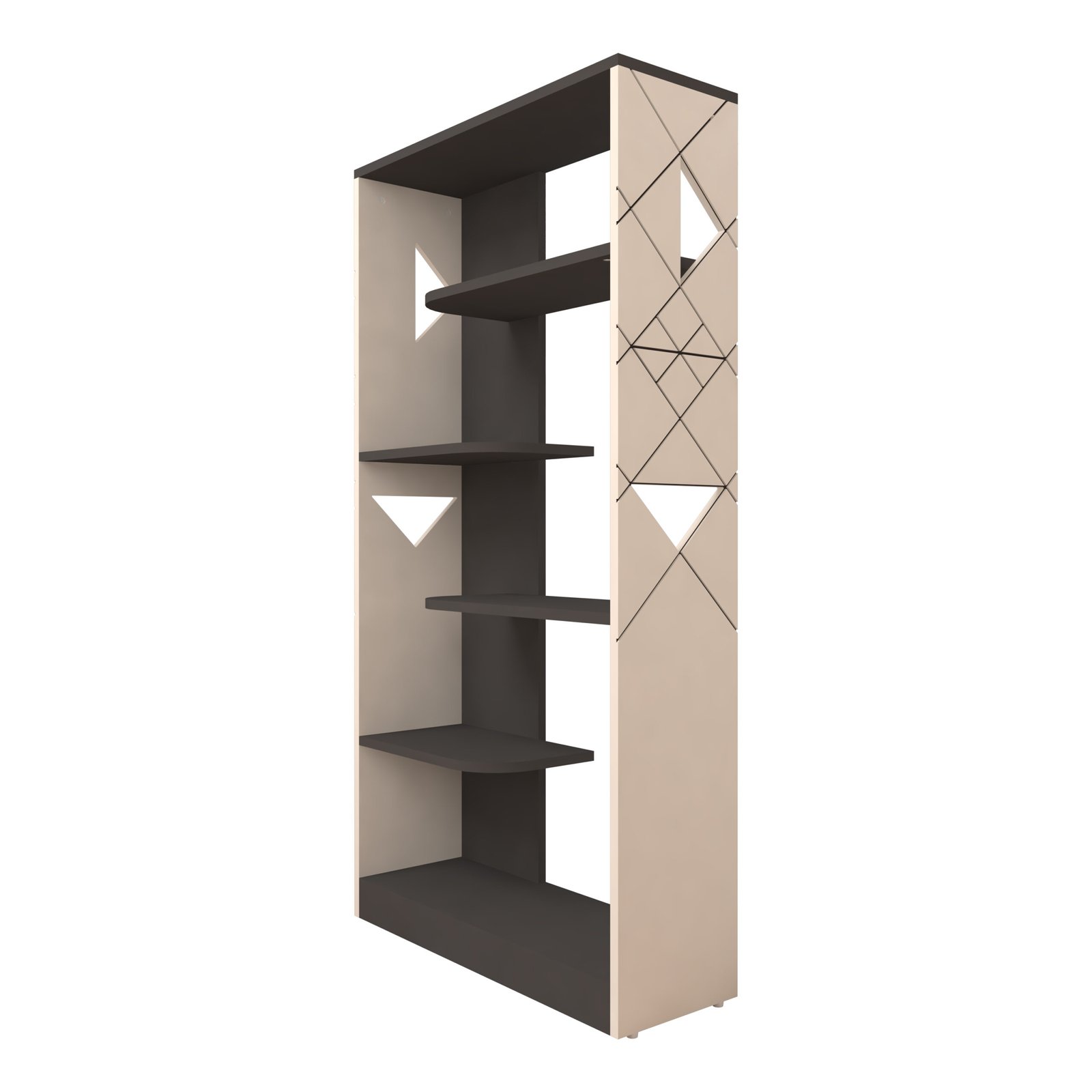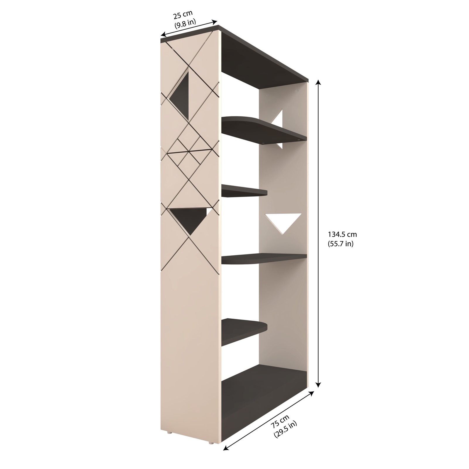 The Zeno Wooden Bookshelf is designed for homes that value both style and functionality. Crafted with a striking asymmetrical shelf layout, it features a designer geometric cut-and-line pattern on the side panels, adding a modern architectural character and visual depth to the unit.