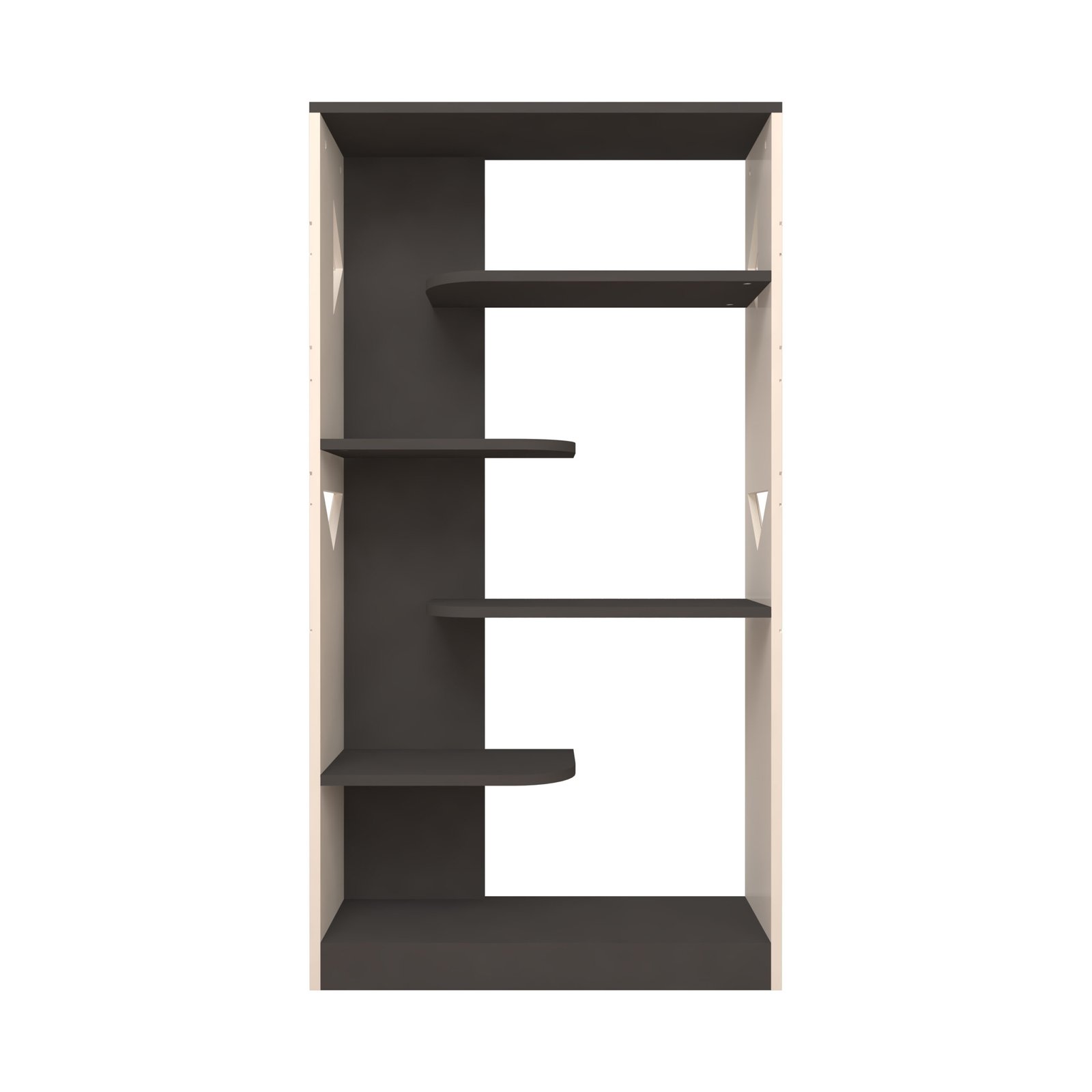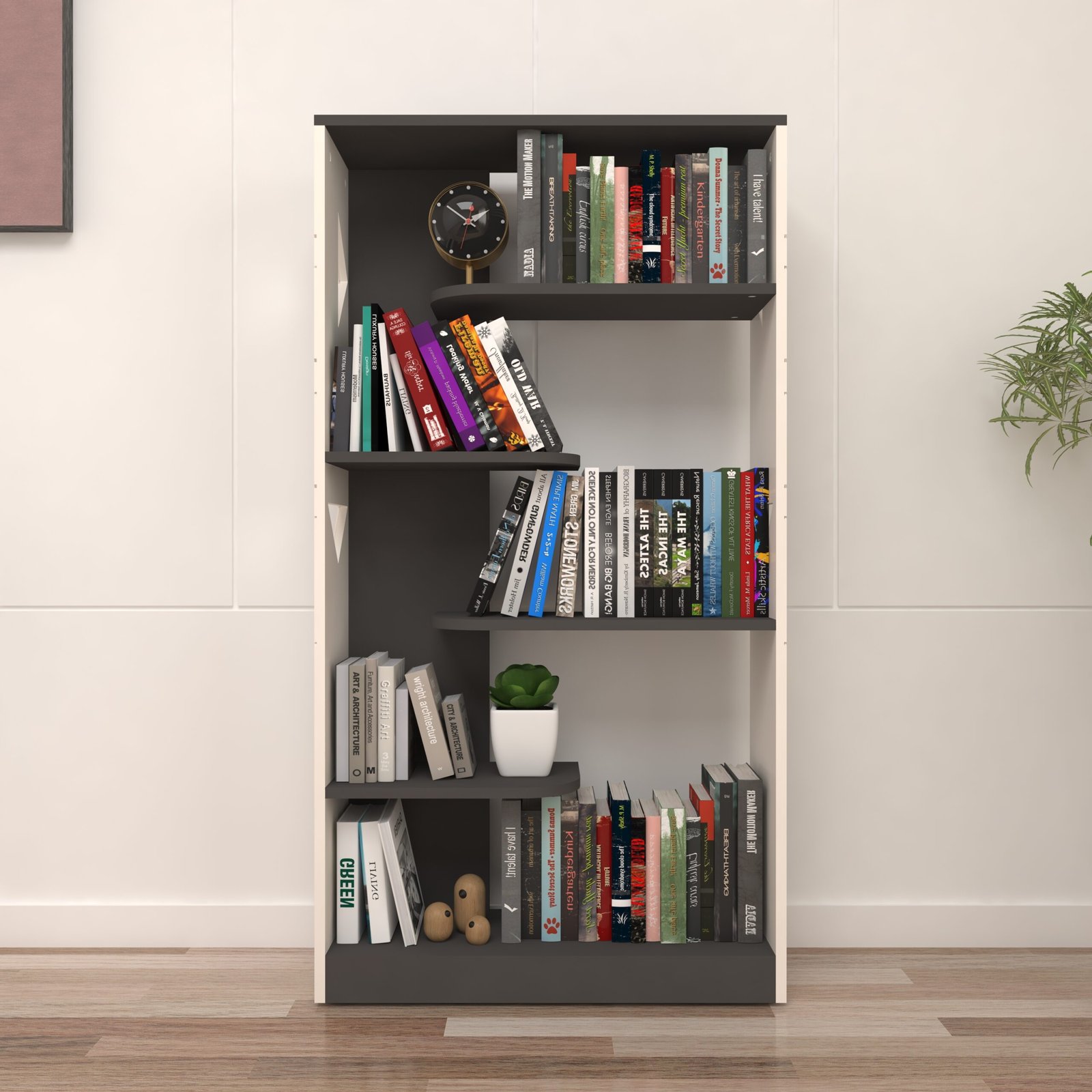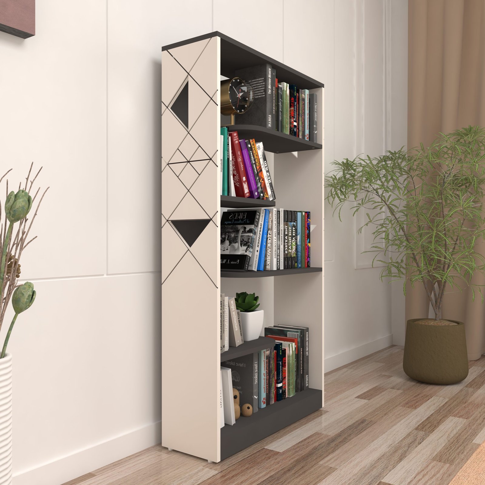 The Zeno Wooden Bookshelf is designed for homes that value both style and functionality. Crafted with a striking asymmetrical shelf layout, it features a designer geometric cut-and-line pattern on the side panels, adding a modern architectural character and visual depth to the unit.